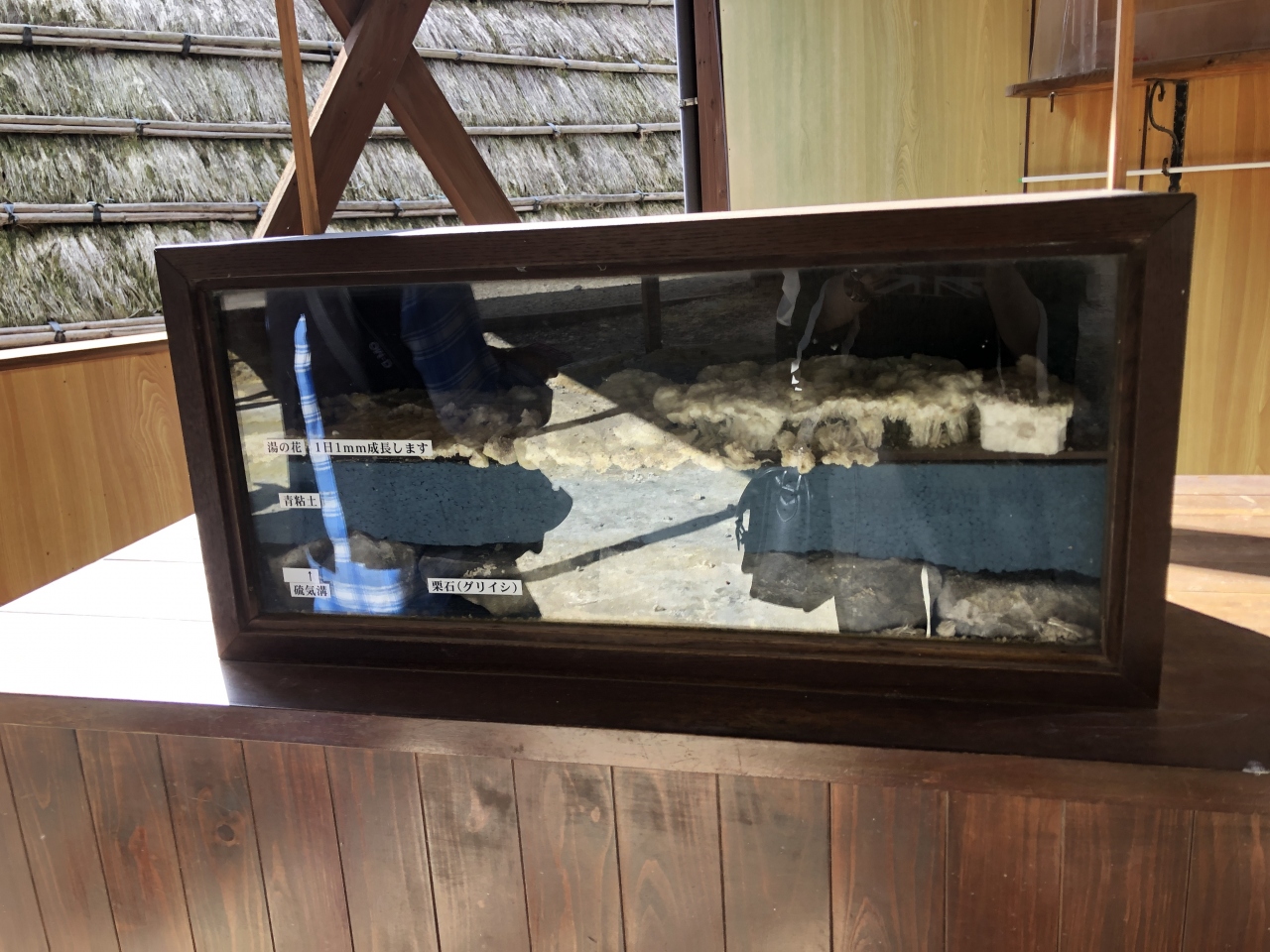 湯の花(お風呂に入れて楽しめる温泉の素のようなもの)が作られる風景が紹介。