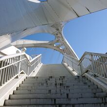 豊田市の、豊田スタジアム付近の矢作川に架かる橋です。こちらの橋の、ユニークな点は、矢作川の河川敷部分から、橋へ上がることのできる、階段が設置されている点。この階段があることにより、遠回りせずに、河川敷から対岸へ向かうことができ、便利だな、と感じました。