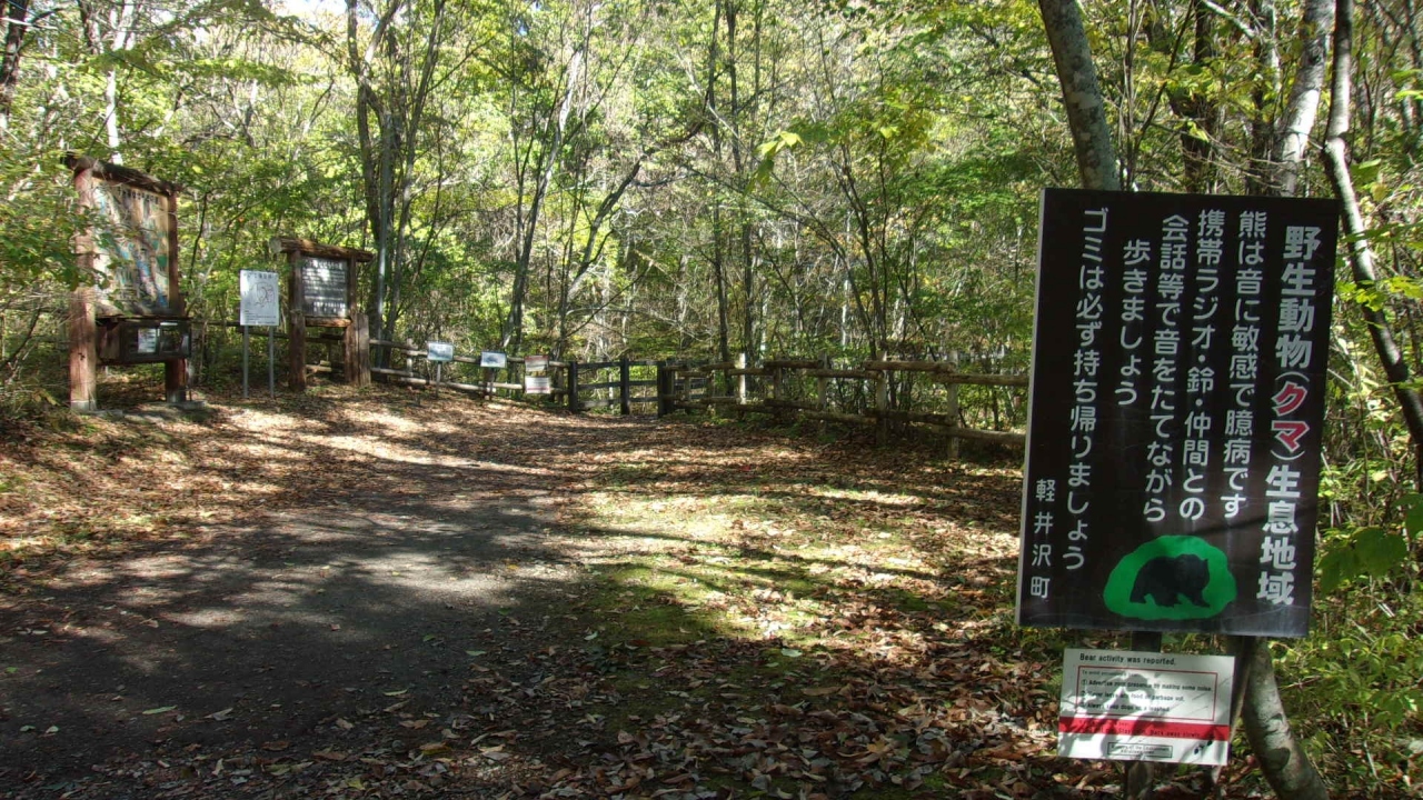 車であれば入口のすぐ手前、トイレもある駐車場まで入ることが出来るが、セゾン現代美術館前からは1.5キロほど舗装林道を歩く必要がある。