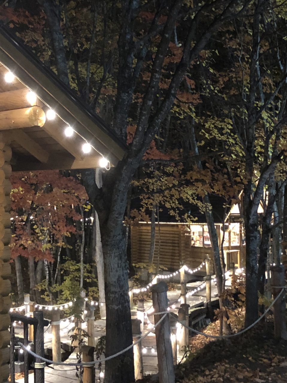 ライトアップされた森の中にある一棟ずつあるハンドクラフトのお店。