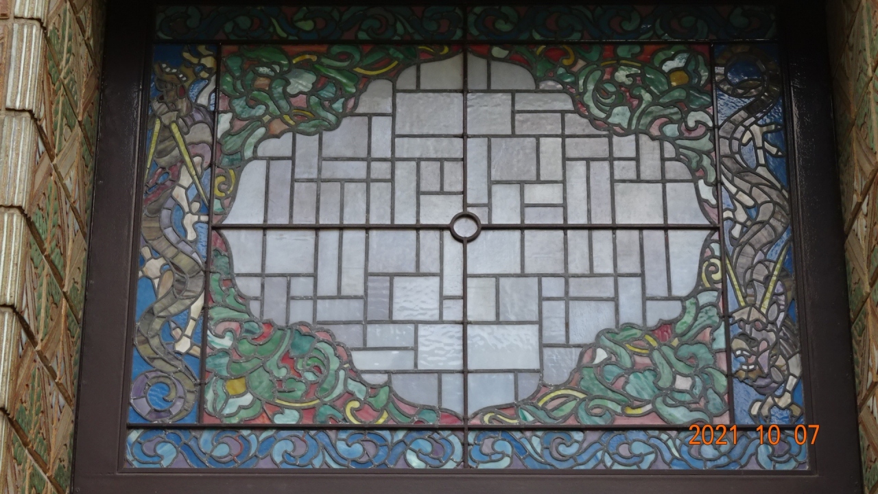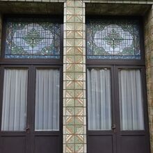 渋沢家の家紋「違い柏」、祝意の「寿」、竜門社の「竜」をデザインしたステンドグラスが有ります。