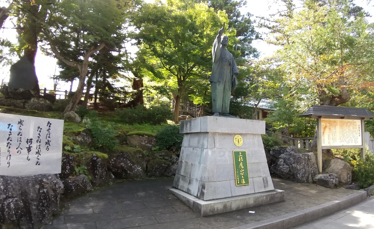 上杉神社の本殿に行く前の道沿いに上杉鷹山公の像が立っていました。有名な「なせば成る なさねば成らぬ何事も 成らぬは人のなさぬなりけり」という言葉の石碑が横にありました。鷹山公は上杉の歴史の中でも大変重要な人物というのがよくわかります。