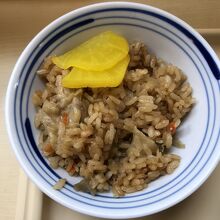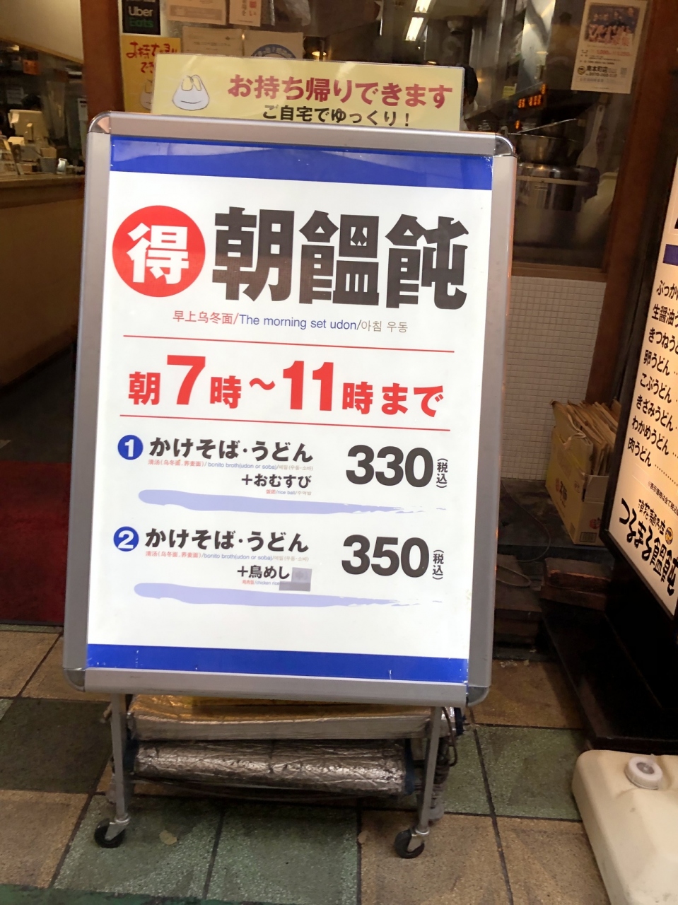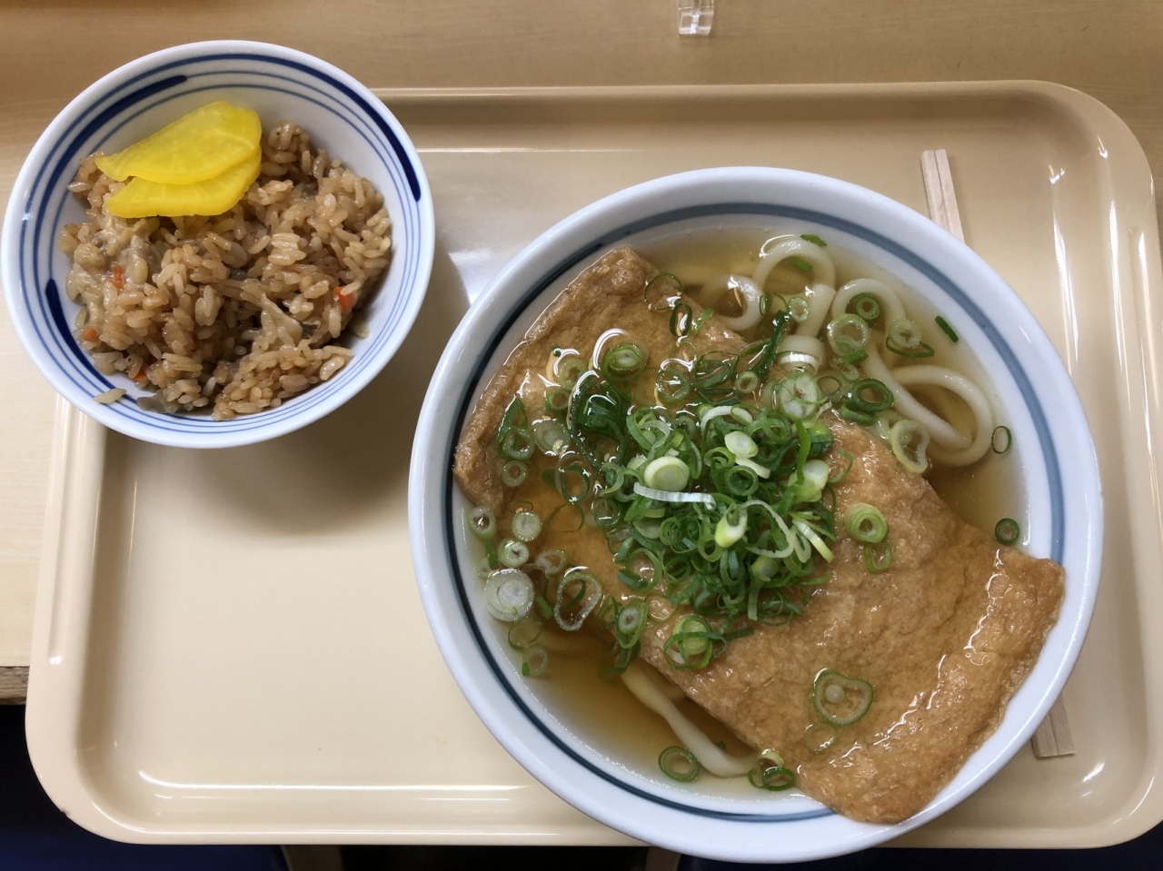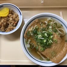 今回は、朝セット(鶏めし)に、きつねをトッピング。きつねはジュワッと甘いもので、お汁との相性は抜群。鶏めしは少し冷めてはいますが、味は程よい濃さで鶏肉もしっかりしている。最近では珍しいおしぼりサービスも嬉しい。