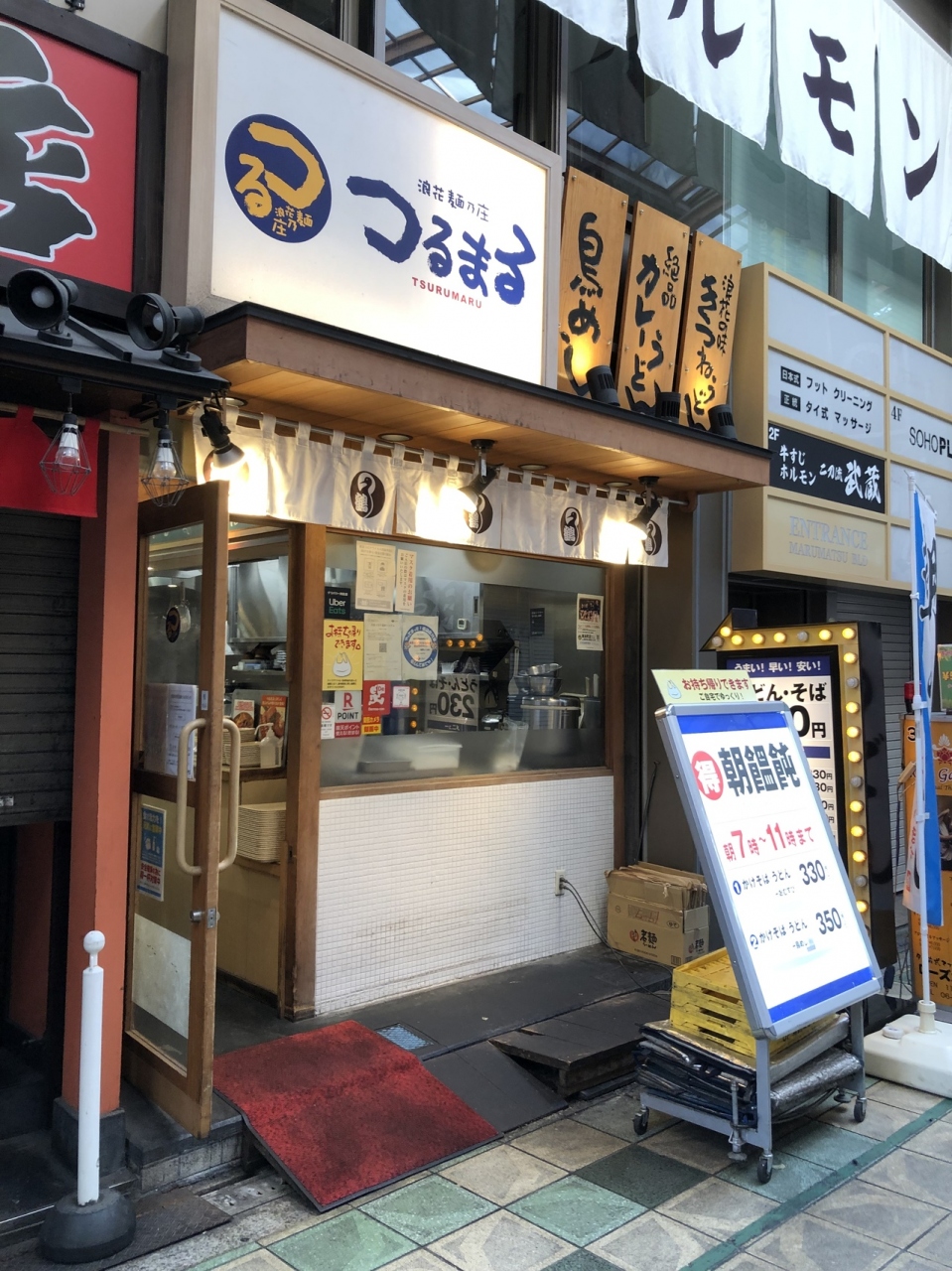 大阪メトロ本町駅からすぐ。南海なんば駅から2kmにわたって続くアーケードの北端、南本町通近くにあるセルフうどん店。つるまる饂飩は、近畿地方を中心に最近は関東でも展開するうどんチェーン。店内で製麺されたうどんは、もっちりしていて喉越しの良い食感が特徴。昆布と鰹で取った関西風のお汁は、シンプルながらも透き通っていて飽きの来ない味。