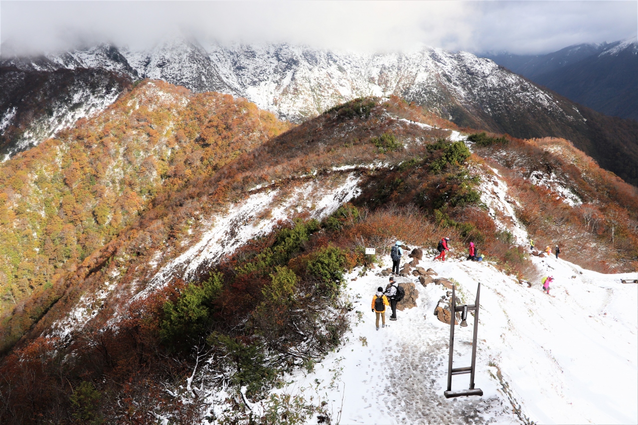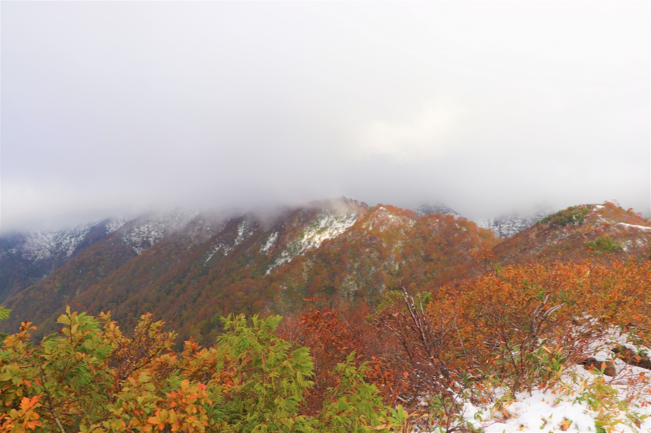 例年、この時期の谷川岳の天神峠からは谷川連峰を彩る紅葉が見られるはずですが、2021年は夏が長く木々の色つきが中途半端な状態で急な降雪となったので、紅葉の彩りはイマイチといった感じです。