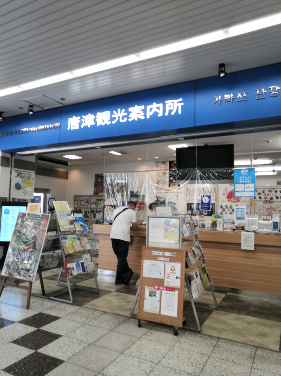 JRの唐津駅の改札を出てすぐ左手にあります。福岡からですとバスも来る人も多いとは思いますが、電車だとすぐにこちらのインフォメーションで資料が手に入るのはいいですね。それほど大きな町ではないので、十分な情報量でした。