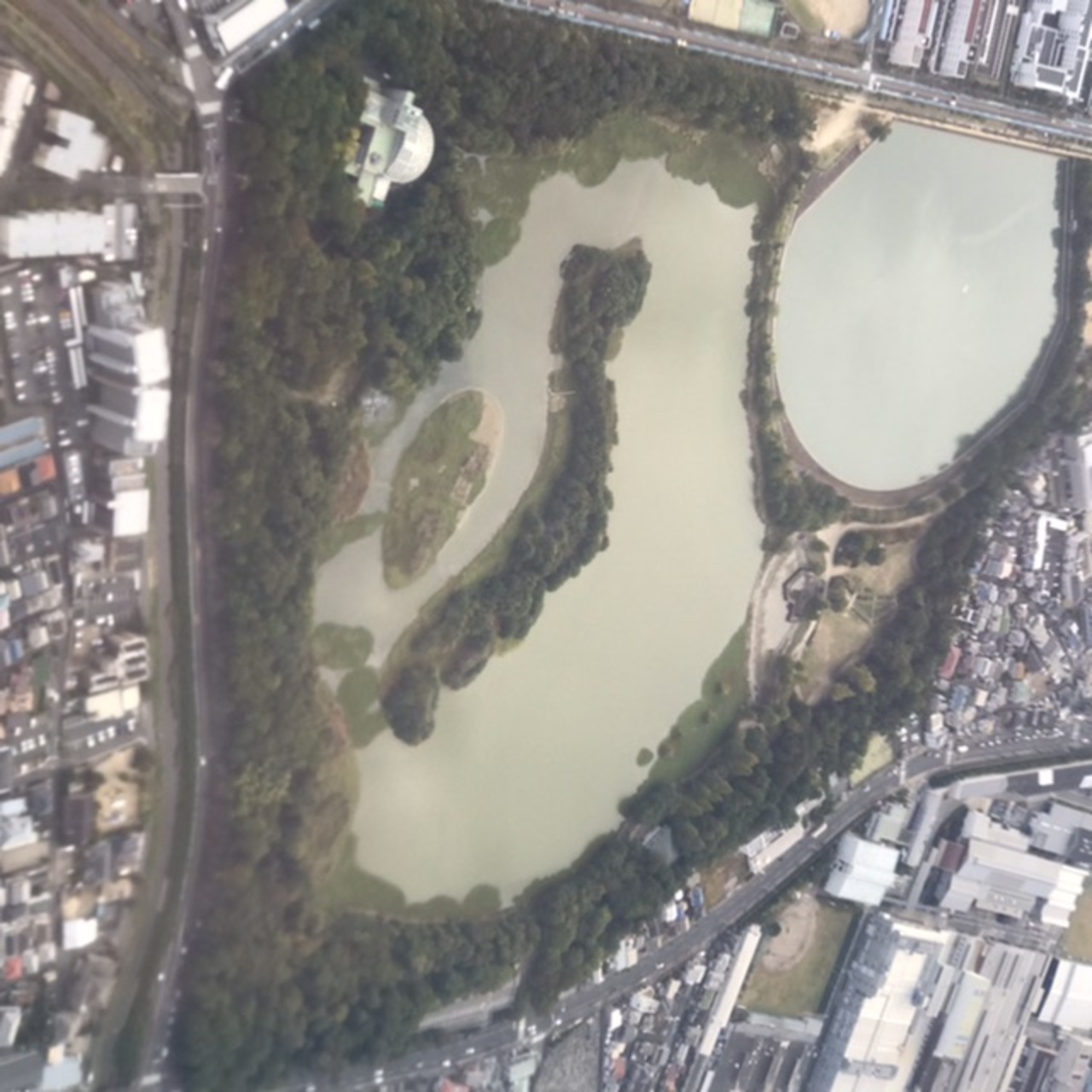地上で行ったこともありますが(「伊丹市昆虫館」に行ったときに)、ここは大阪国際空港(伊丹空港)から離陸した便から見る池のミニ日本列島が有名です。
