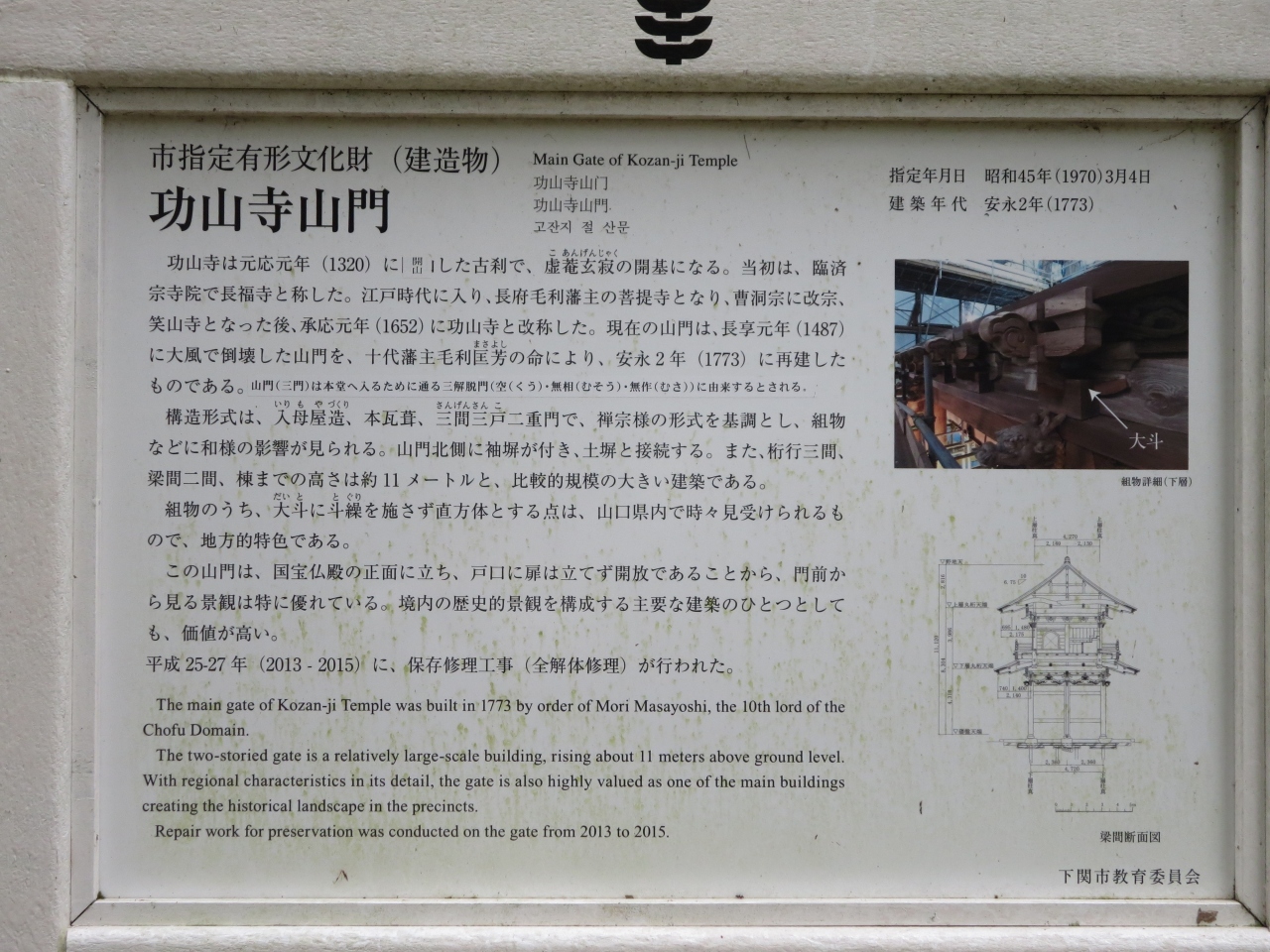 下関の城下町長府にある毛利家の菩提寺、功山寺の山門です。市指定有形文化財に指定されていて、静謐な紅葉に囲まれた参道を登っていくと、見えてくる二階建て門です。観光客の姿も少なく、門の両側には狭いながら、庭が設けられ、水の流れもあり、静かな雰囲気を味わえます。