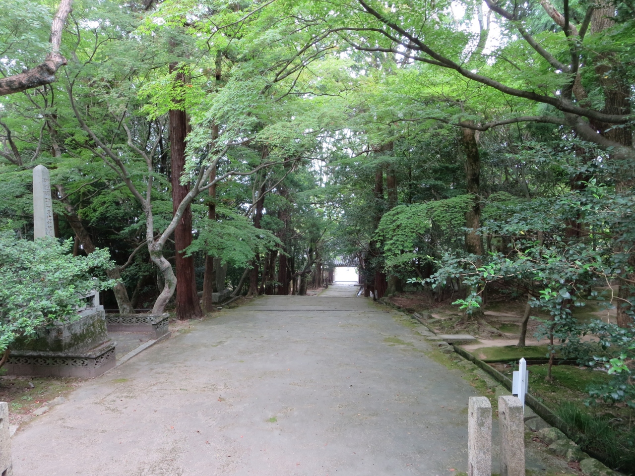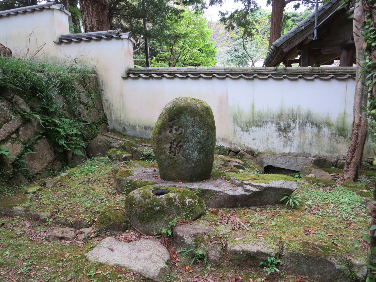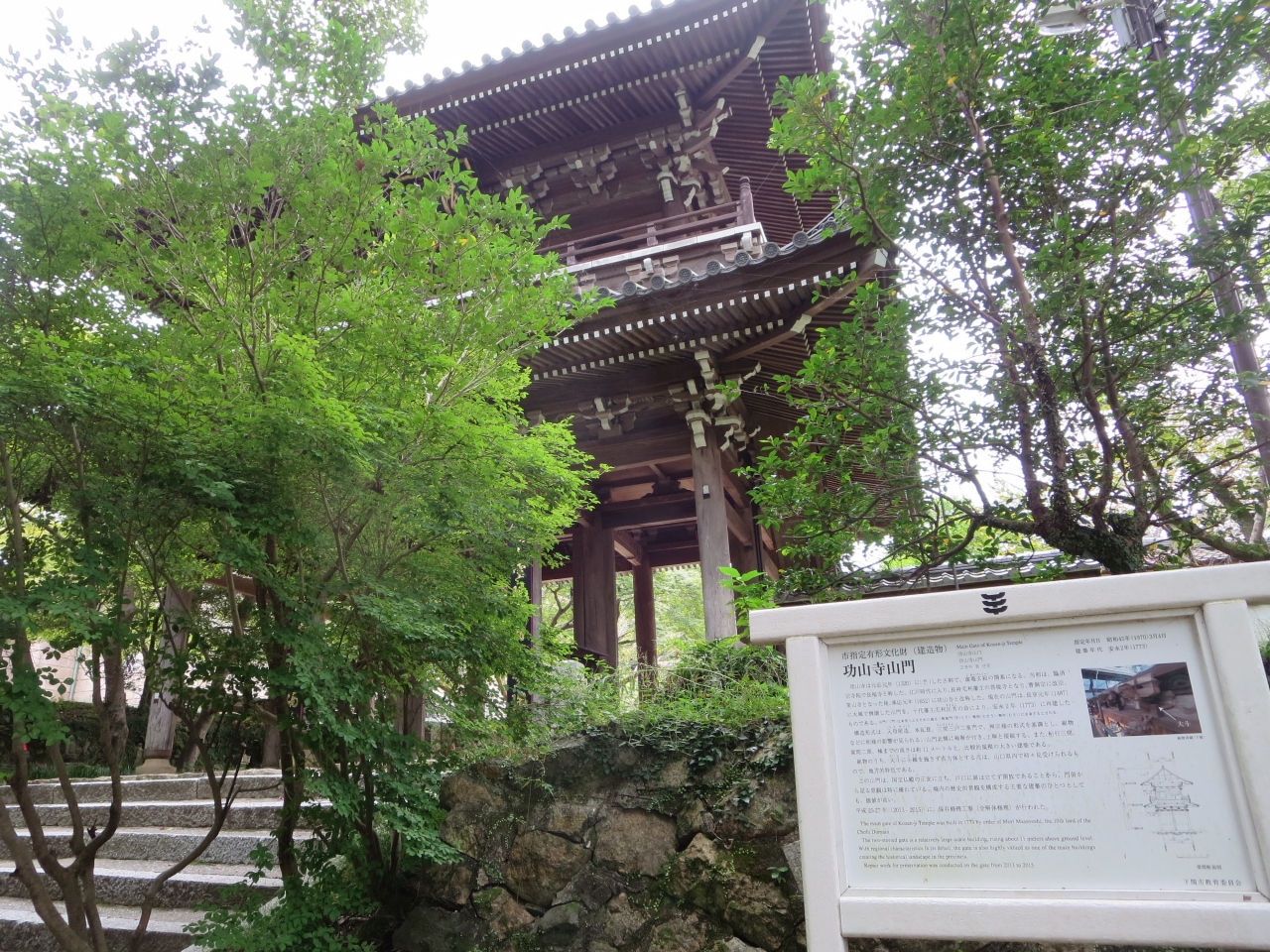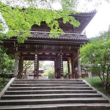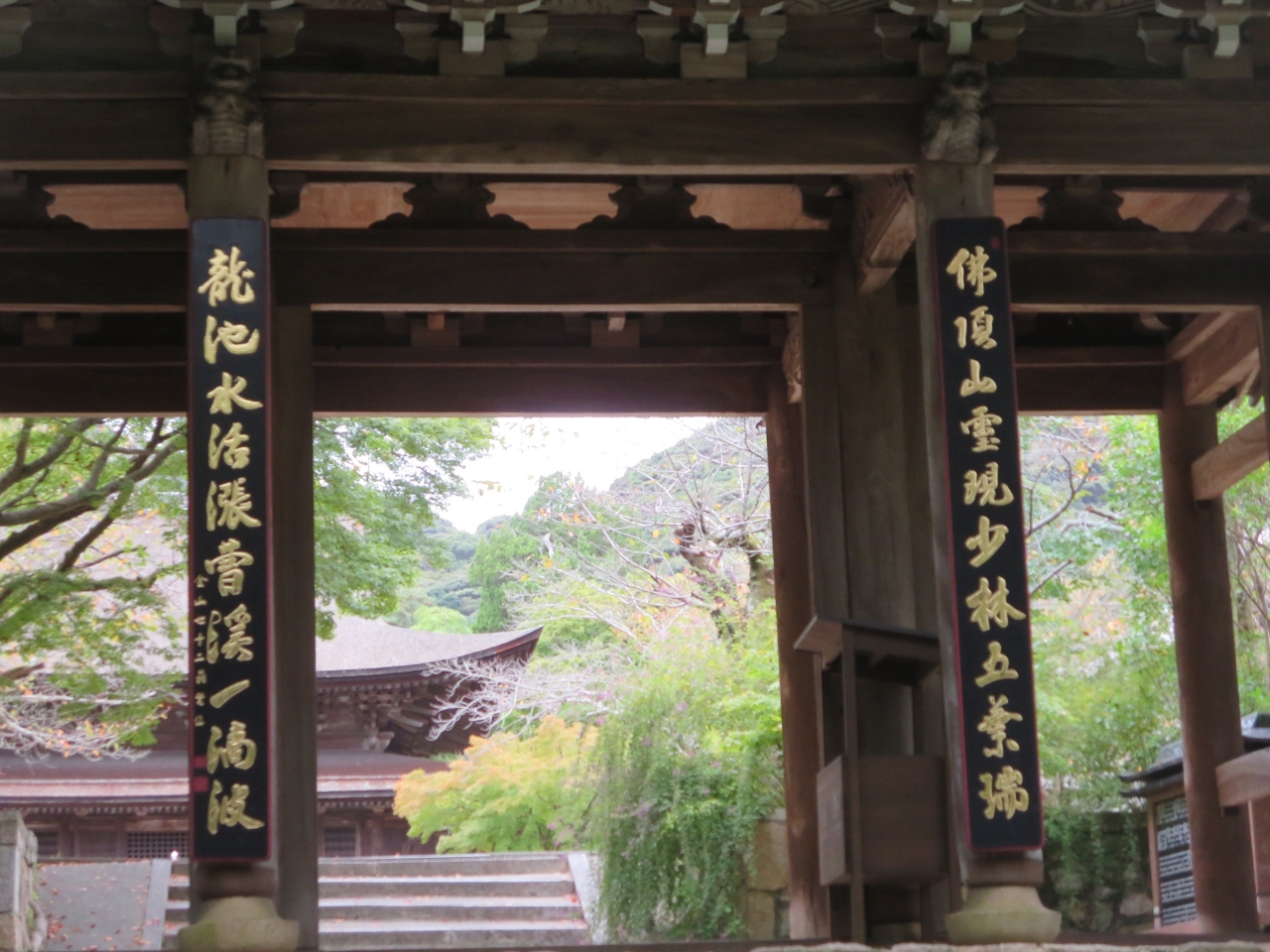 門の奥の階段を登った所が功山寺の仏堂などがある開けた場所になっています。門の左右の柱には金文字で何か書かれていますが、仏堂側から見ると、一寸色合いに乏しい門に見えてしまいます。
