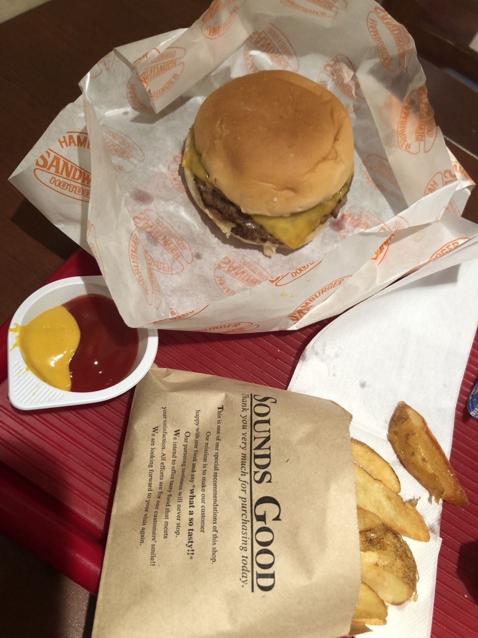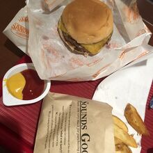 チーズバーガーのモーニングセット(ポテトつき)をオーダー。まず、チーズバーガーは、パテもしっかりしていてパンズも値段の割に頑張っている印象。手作り感があります。大手チェーンにはない揚げたてのポテトは、じゃがいもをざっくり大きめに切って揚げたもので、量も多く、あじはじゃがいもそのものの旨味が味わえます。