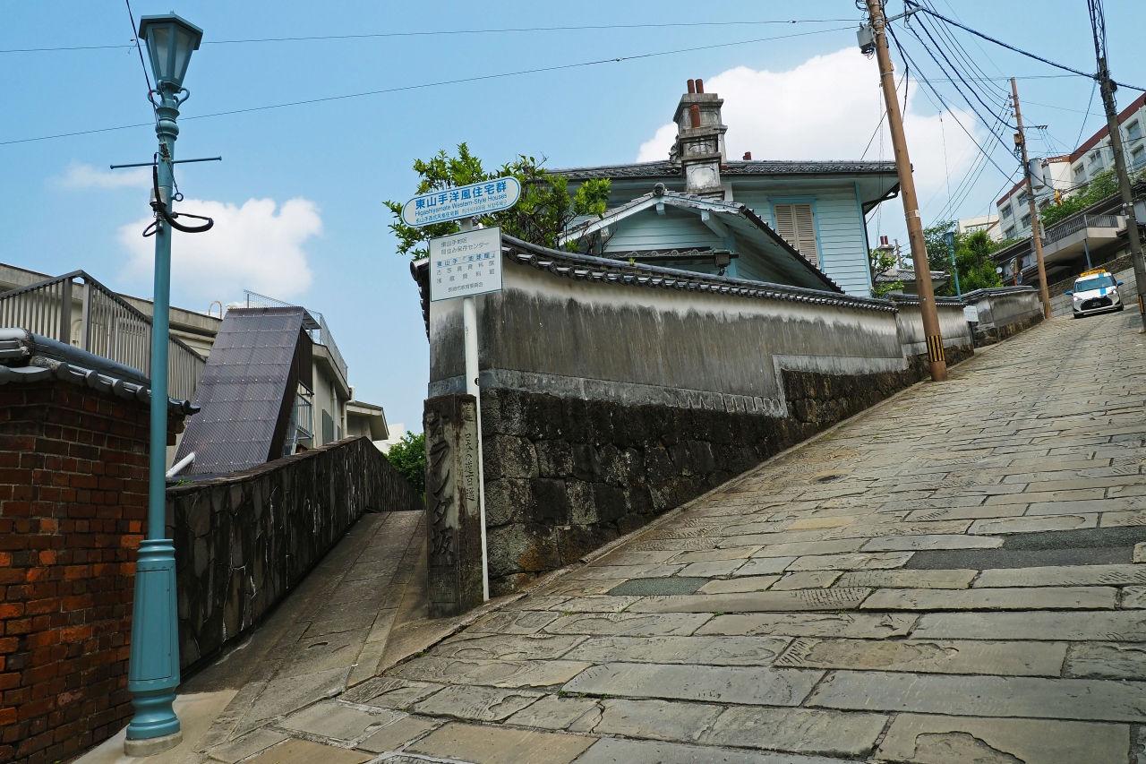 活水学院から孔子廟裏の石畳は最も有名なオランダ坂(昔は西洋人が歩く石畳の坂道はすべてオランダ坂と呼ばれていたそう)で、この辺りは東山手洋風住宅群をはじめとする古い洋館らが立ち並び、学校も多くて住宅地が広がっています。