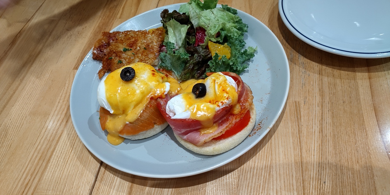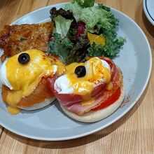 エッグベネディクトはベーコンとサーモンのもの各一個づつ。