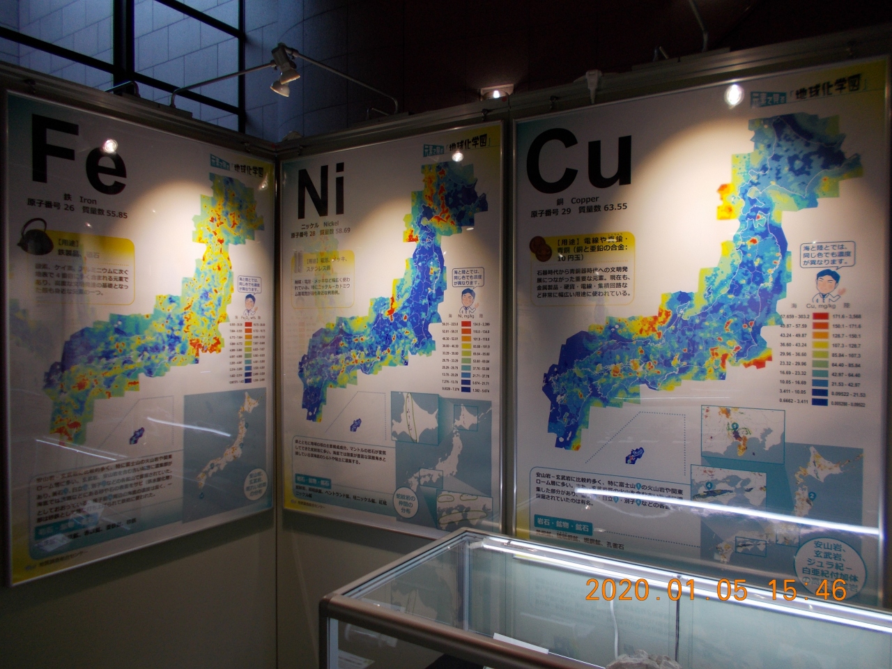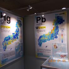 入り口を入ってすぐのスペースで、日本列島を形成する元素についての企画展が行われていた。鉄やニッケル・銅・亜鉛・鉛等、日本列島やその周辺に濃度の高い場所が分布している様子が分かる。鉄は陸上でも多い場所が沢山あるのに対して、亜鉛は瀬戸内海、鉛は日本海側に高濃度に存在することが分かる。
