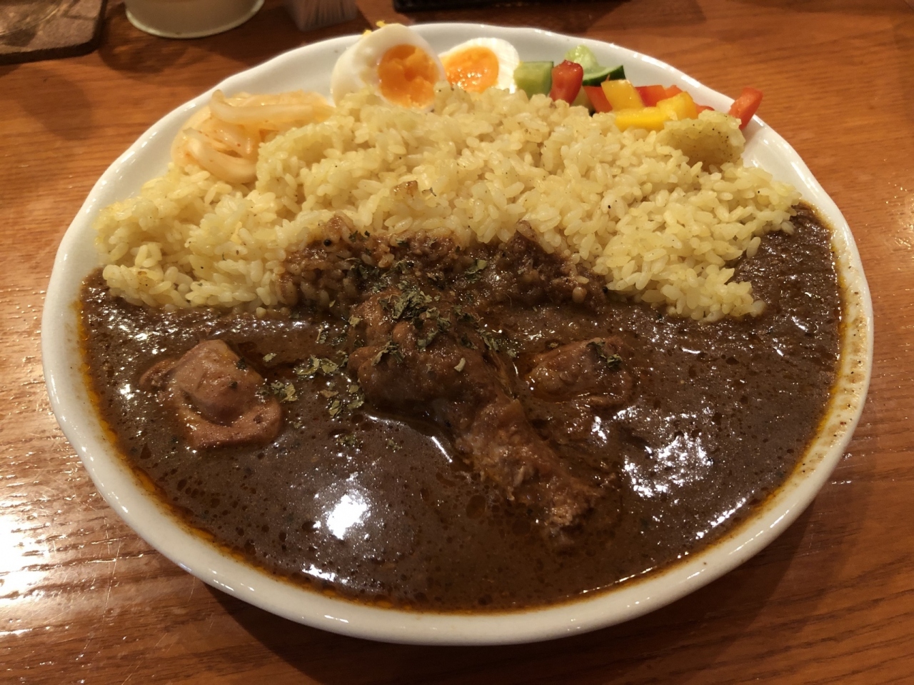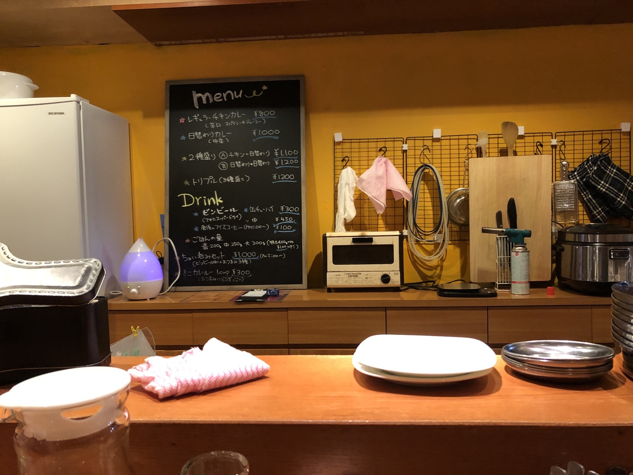 せんびる(船場センタービル)10号館地下1階、船場女将小路にあるカレー店。店内はカウンター席とテーブル席があり、店内では店主の奥様がファンというBon Jovi(ボン・ジョヴィ)のBGMが流れていたり、フィギアが置かれていたりします。もともとは北新地で毎週月曜日のみ、ラーメン店を間借りをして営業していた「幻のスパイスカレー」と呼ばれていたカレー店で、2021年3月にこちらにオープン。