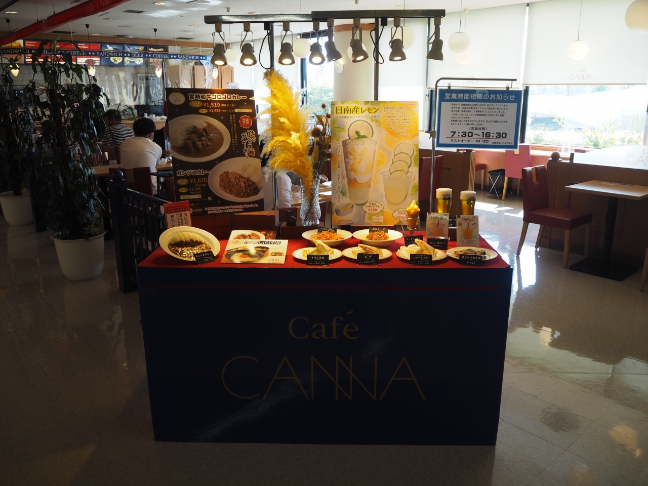 カンナは宮崎空港のターミナルビルの1階の中央部にある店です。食べ物はカレー、パスタなどの定番のものがありますが、ほかには日南レモンのパフェ、スカッシュなどのおすすめもあります。店はオープンスペースで、店の入口にメニューと商品のモデルがあるがわかりやすくていいです。