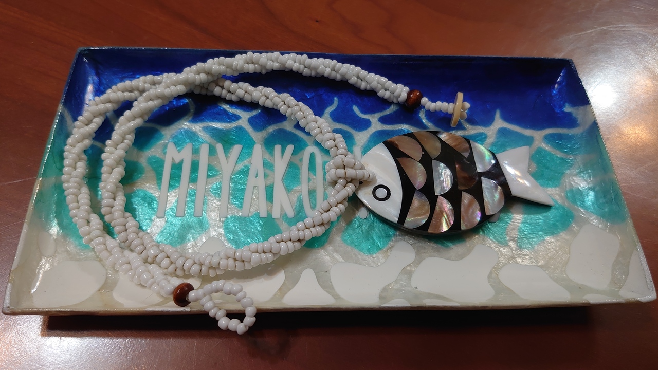 カフェパニパニの奥にあって、青空パーラーの並びにある雑貨屋さんですが、アクセサリーやリゾートドレス、お土産になる小物類もあって見てるだけでも楽しくなるお店です。小さいお店なのにこの日も何組もお客さんがいました。数年前に買ったシェルのペンダントを探したけど好みの物が無かったので、シェルのトレーを記念に買って帰りました。