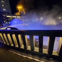 白い湯気と、紫色のライトアップが