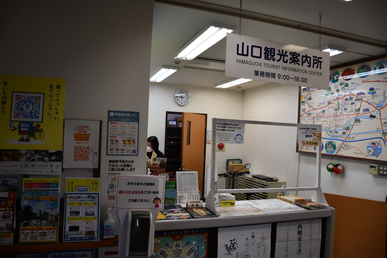 山口線の山口駅構内にある観光案内所です。改札口を出て、目と鼻の先にあります。市内の名所巡りについて、親切に教えていただきました。バスの便が少ないので、貸し自転車がお薦めです。所内には、電動自転車の貸し出しもありました。