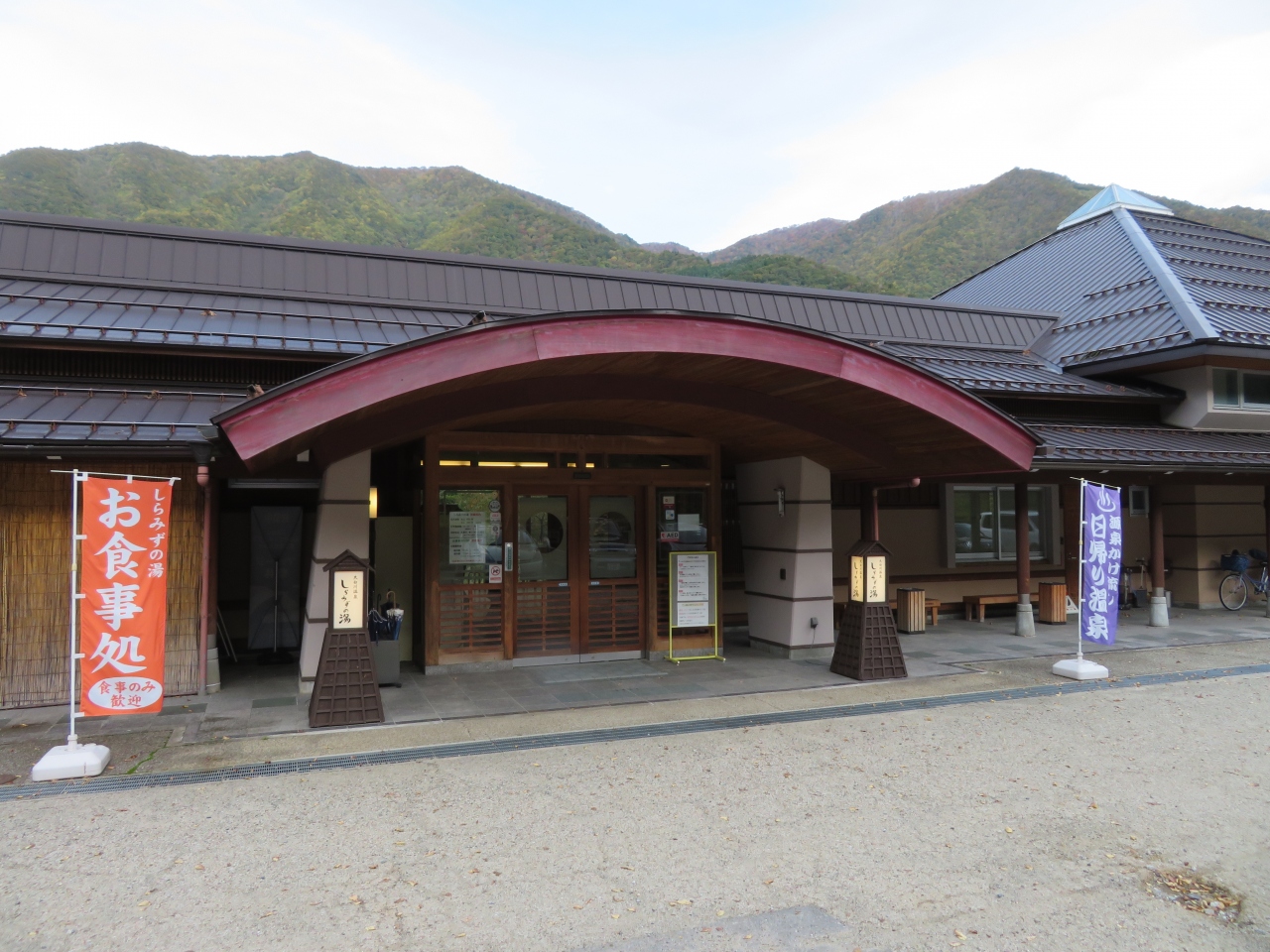 約15キロ離れた山の上にある大白川温泉からの弾き湯で、あまり癖のない柔らかいお湯です。露天風呂は周囲の山々を見ながらのどかな雰囲気でした。