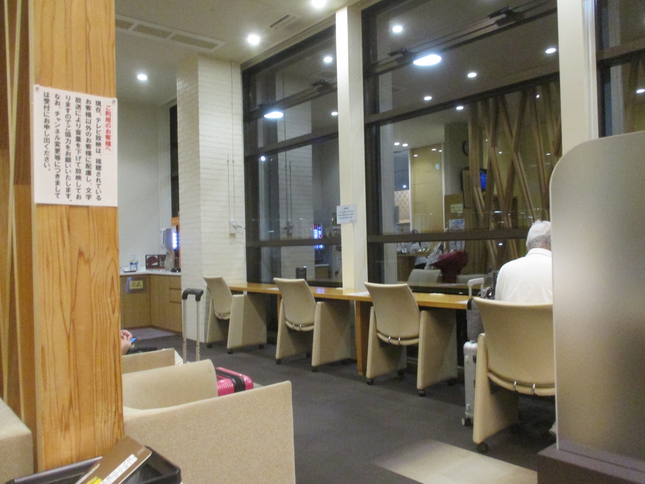 ラウンジ内の入口付近にビジネス向けのテーブルが設置されており、2カ所のブースがありました。荷物をテーブルや横に置くスペースがあり、大きいPCでも利用できる台でした。空席があったので、早速座席を確保してネットをしていました。秋田空港ターミナル内の椅子は堅かったのですが、こちらは長時間座っても苦痛に感じなかったです。