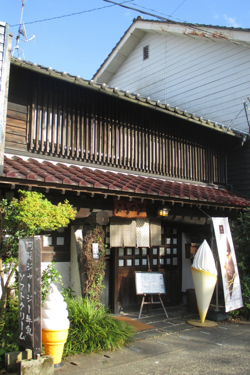 表にある水基には「語らいの雫」と名付けられていました。喫茶店にはぴったりの命名ですが、今時は黙して語らずがつらいところです。こちらでは表に看板の出ていた「阿蘇ジャージー牛乳ソフトクリーム」を戴きました。Mサイズ、Sサイズがありましたが、食べ歩きが続いていますので、Sサイズにしました。でも、Mサイズの間違い?と思うくらいのボリュームがありました。