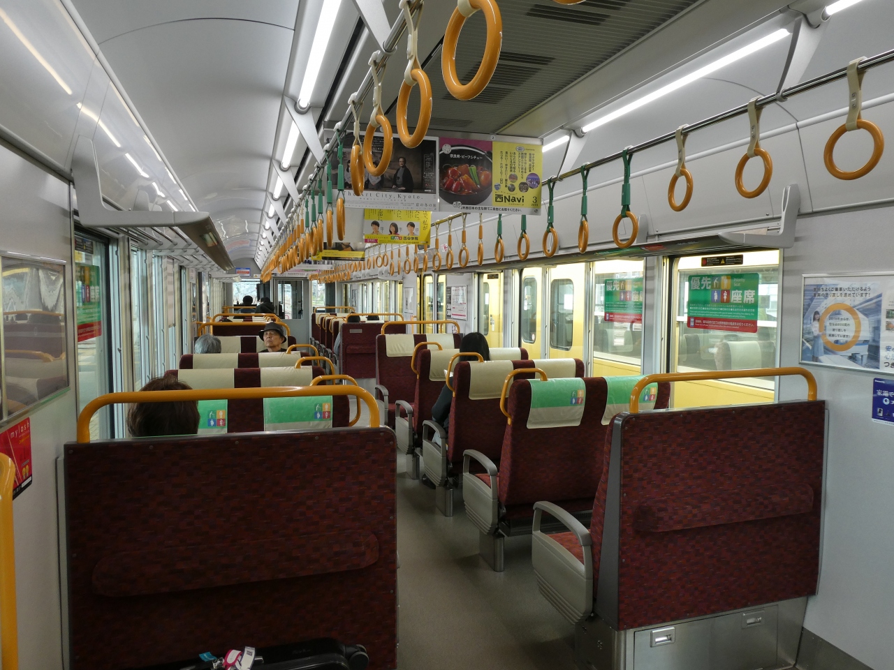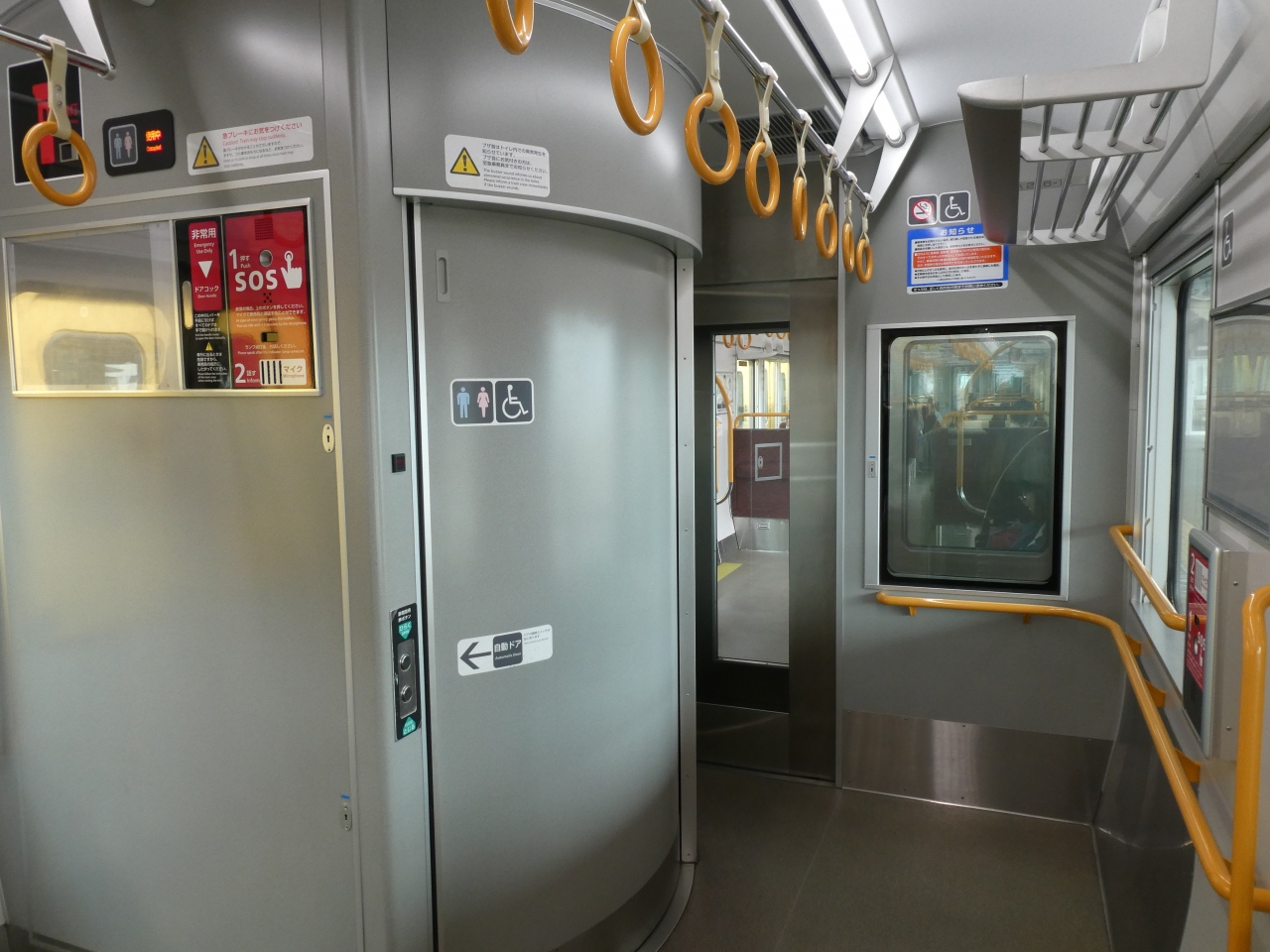 電車は広島近郊エリアで活躍している新型車両の赤が目立つレッドウイングで車内には大きなトイレも完備しています。