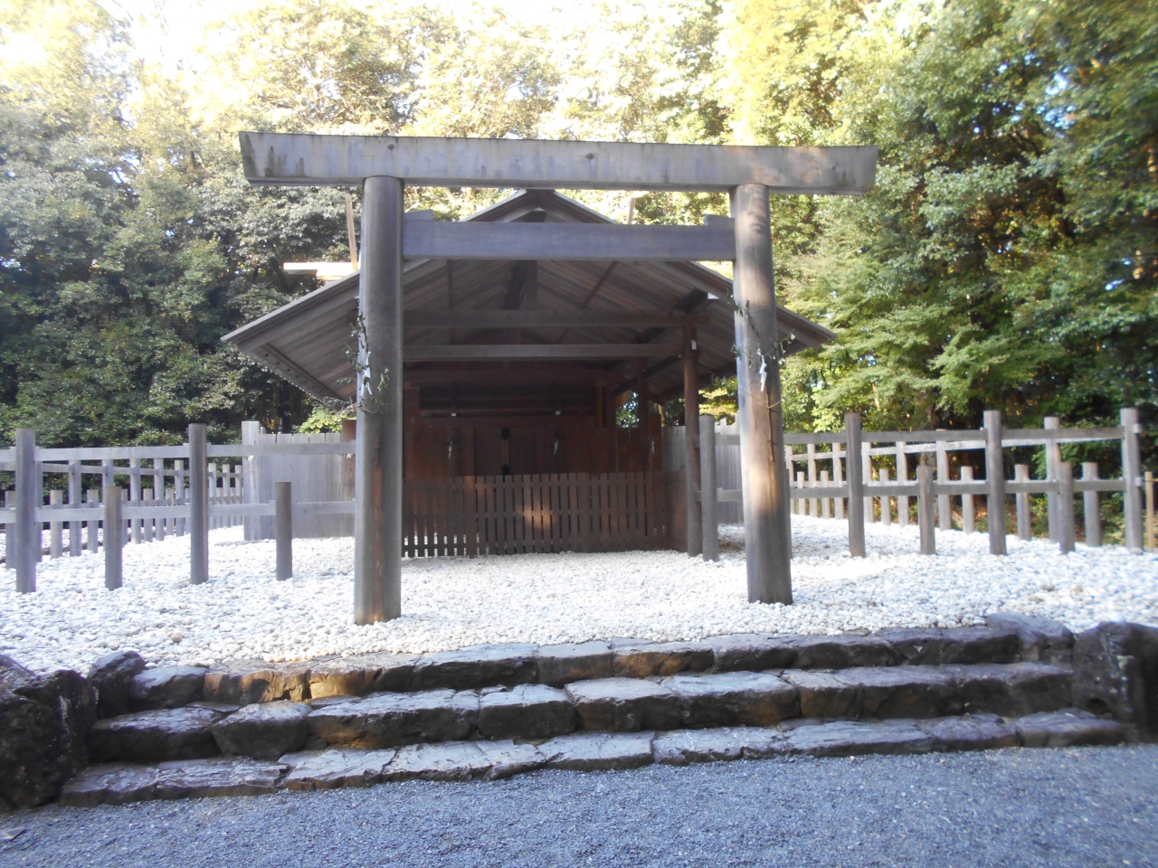 車通りから奥へ、くねくねと木々の中の道を歩いていくと、どんどん静かになって、やがて社があらわれます。社殿の隣に古殿地があるのは内宮と同じ形式。人がいないのでゆっくりと神聖な雰囲気を味わうことができました。