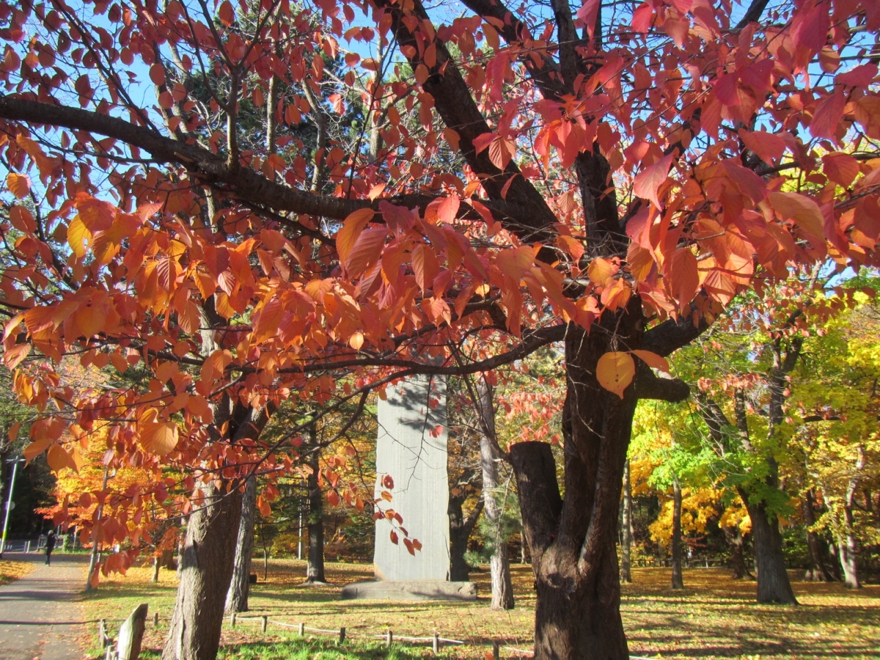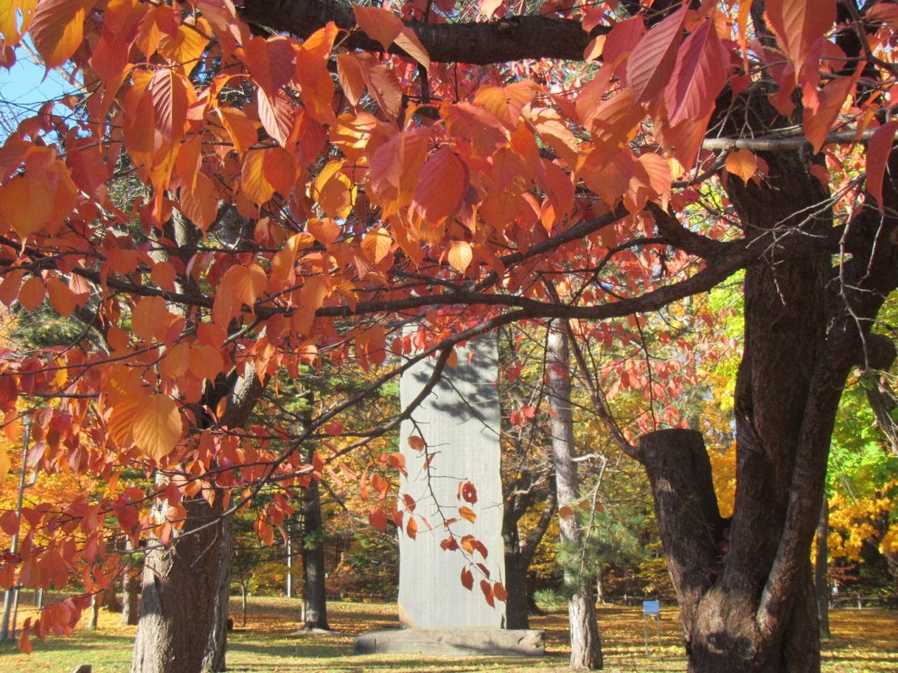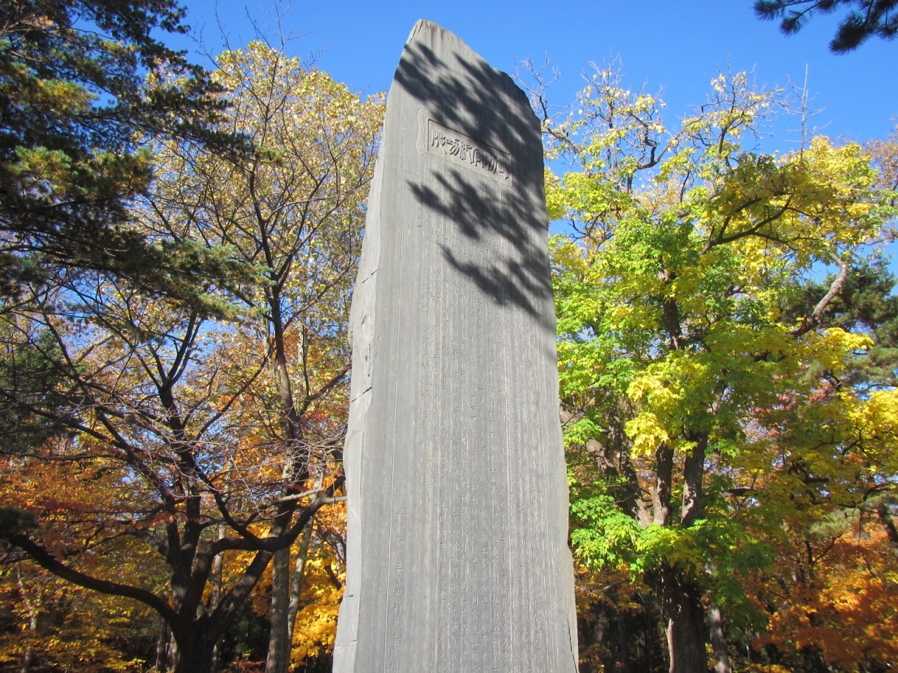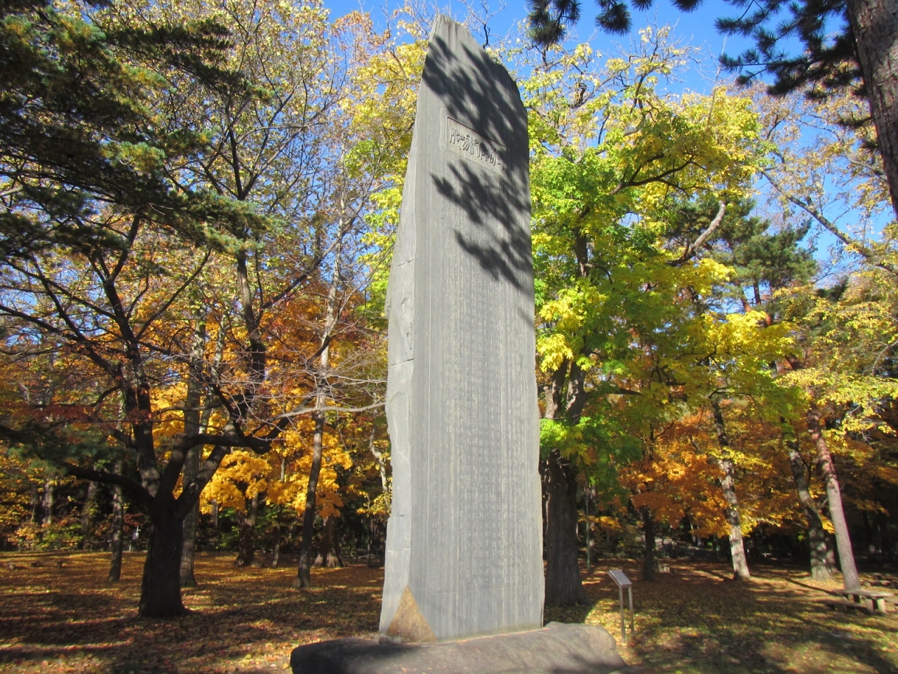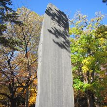 10月下旬、紅葉の木立の中に佇む背の高い石碑