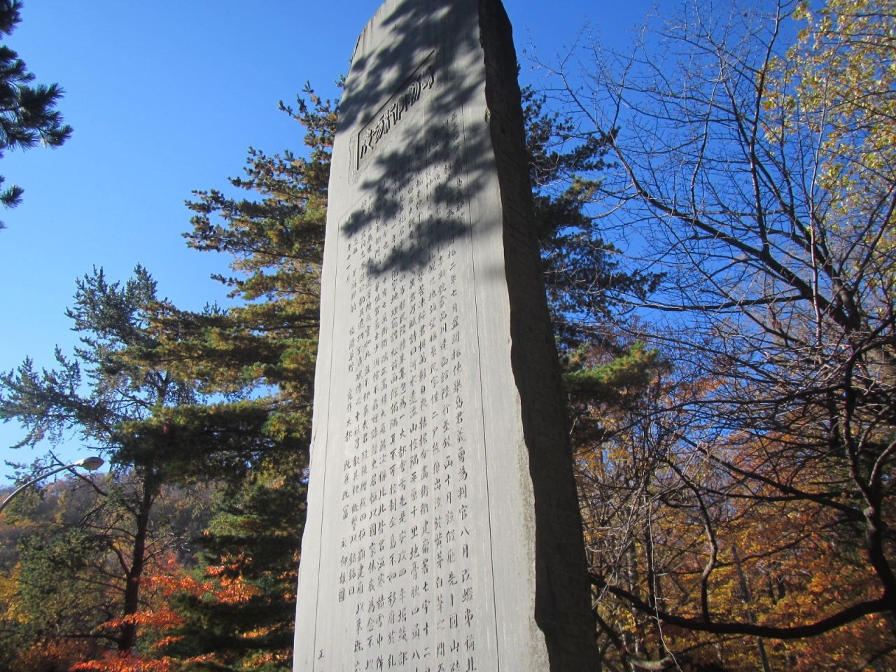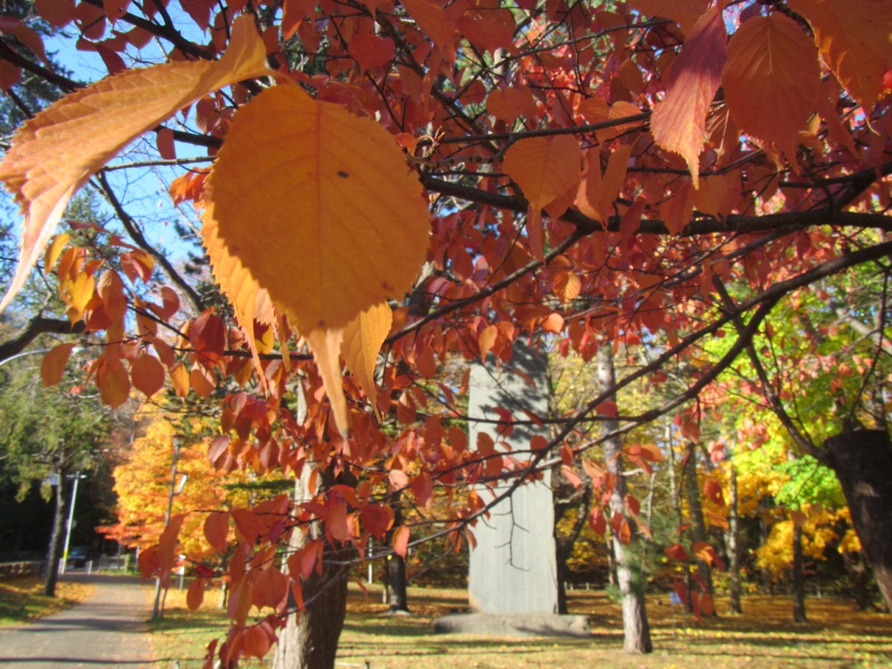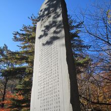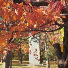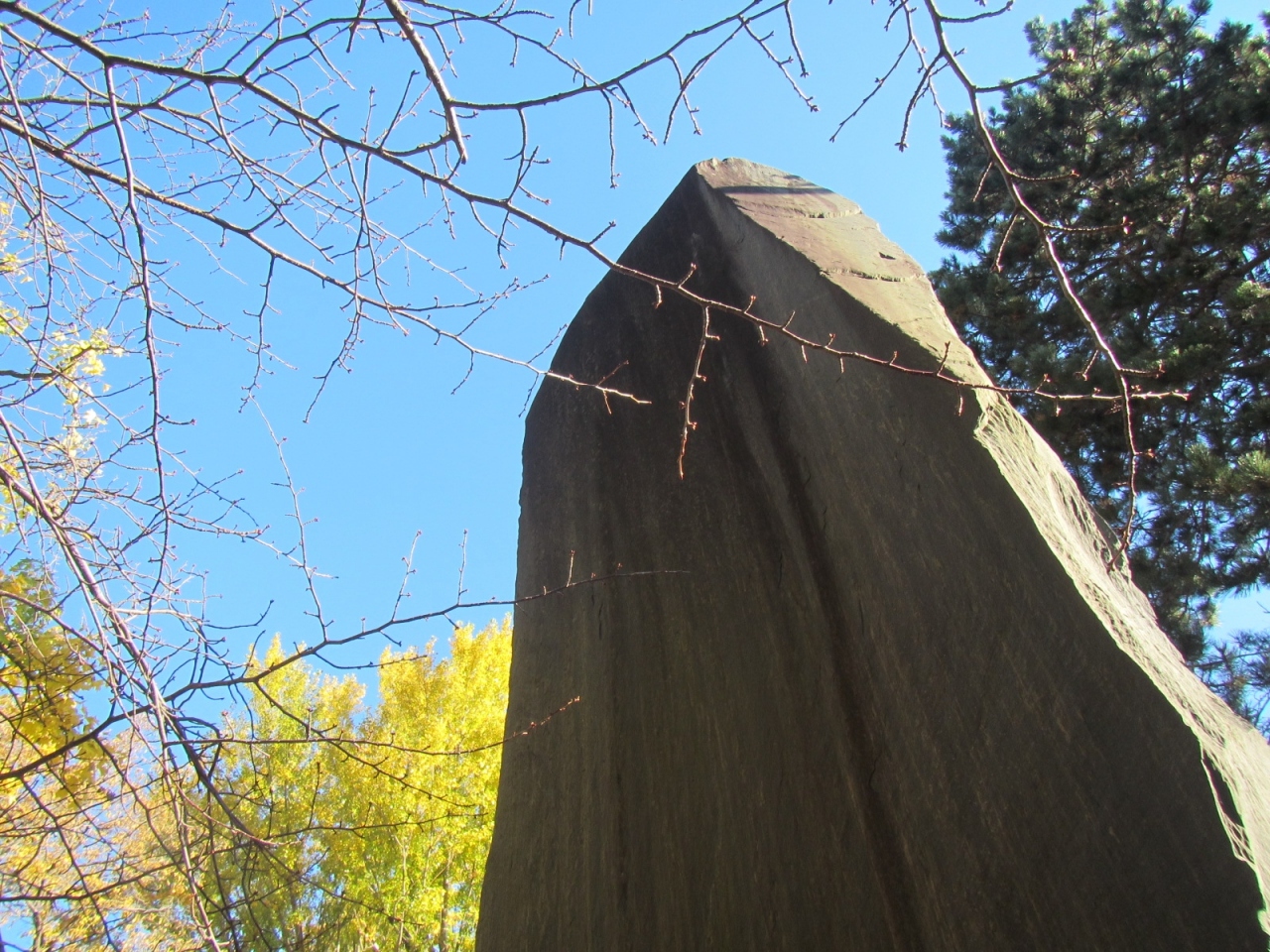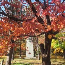 10月下旬、紅葉の木立の中に佇む背の高い石碑