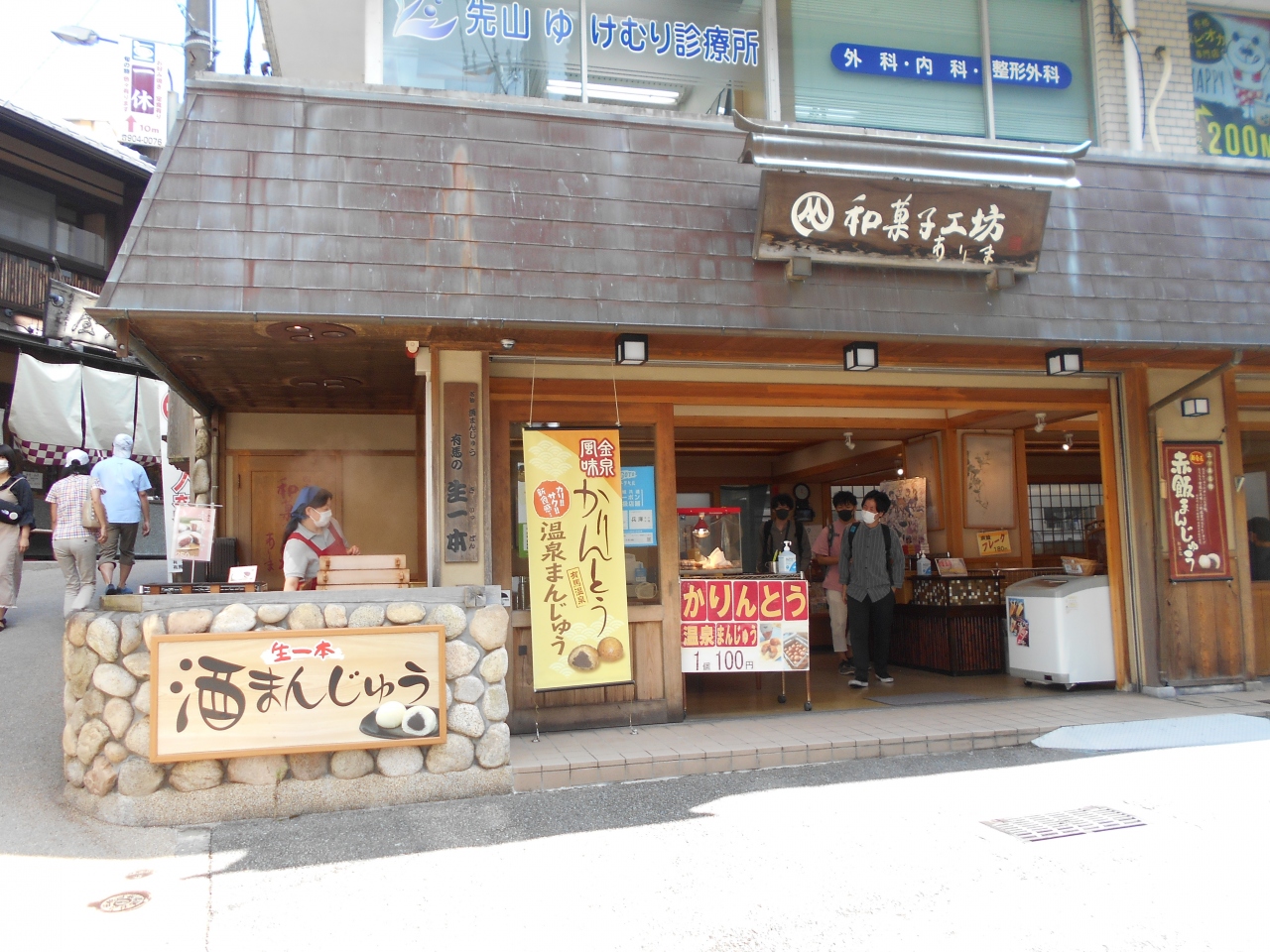 日本最古の温泉の一つ「有馬温泉」の観光のメインストリート湯本坂の下にある金の湯の足湯隣にある和菓子御土産店。酒まんじゅうの看板と店頭の蒸し器が目を引きます。足湯に浸かってホクホクの酒まんじゅうを頬張ると疲れが吹っ飛びます。