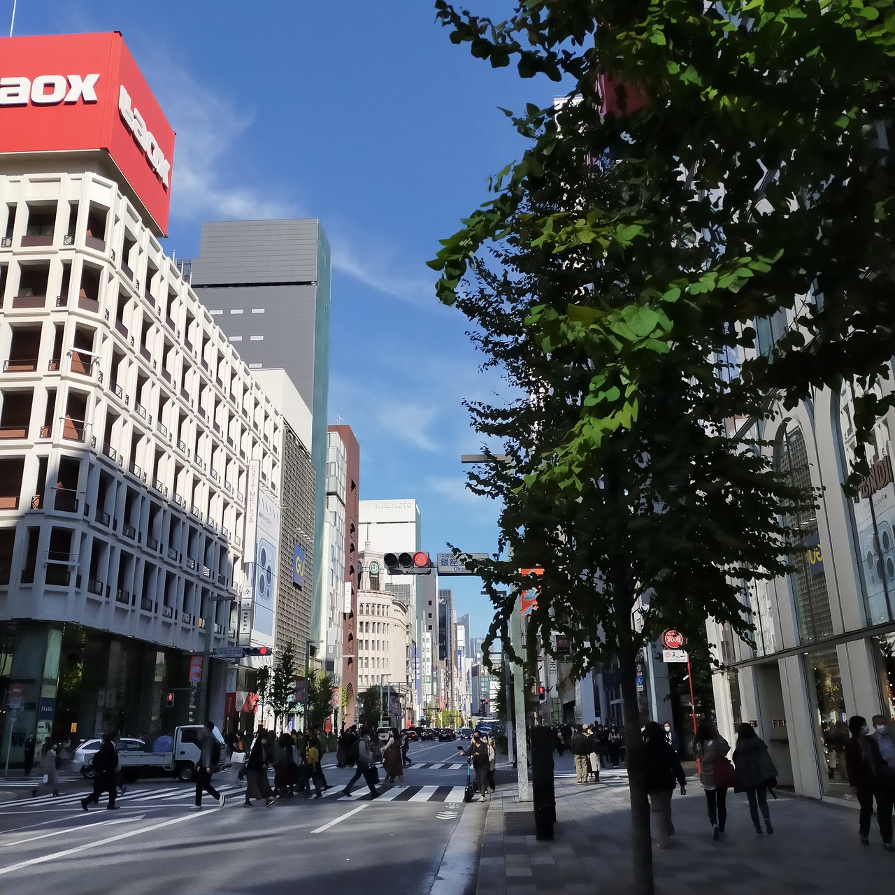 土曜日の昼間に行ってきました。銀座の交差点を東西に通る大通りです。日本を代表するショッピング街です。ちょうど、12時だったからか、歩行者天国の始まる時間で、警察官が通行止めの仕切りを運んでいくところを見ました。