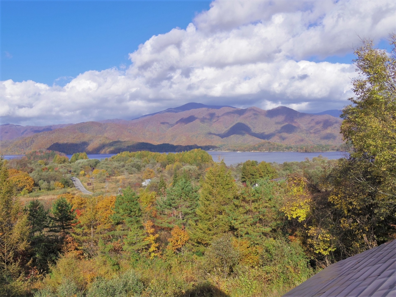 尾三宅屋さん、軽食の食事のコンニャクなどがあり、屋外には野菜や果物を売るテントもでていました。 屋内の階段を上ると狭い展望台があり、そこから桧原湖を少し眺められます。