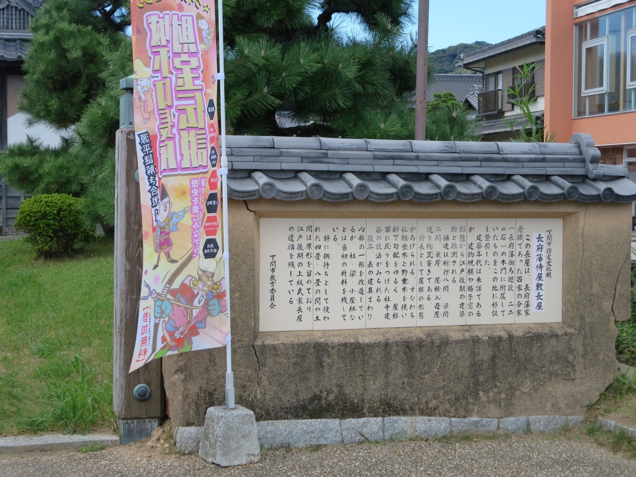 下関長府の壇具川沿いに功山寺を目指して歩いて行くと、川沿いに土塀に囲まれた長屋があります。長府藩家老職の分家の本門に付属していたものをこの知に移設したものです。江戸後期の建物と言われ、表具類は改造されていますが梁、柱などは当時の材料をそのままにしているそうです。川沿いにあるので場所は判りやすく、質素な外観にも関わらず屋根は反りを設け、寺社建築の様式を備えているので、外回りを見るだけでも江戸時代の長屋を見学する楽しみがあります。