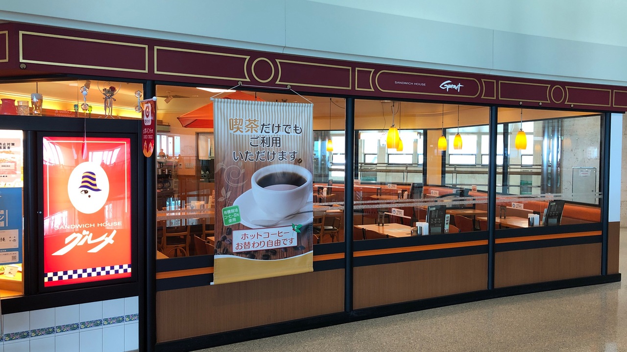 那覇空港レストランフロアにあるサンドイッチカフェです。サンドイッチだけで1000円以上する物もありますが、ボリューム満点です。グルメは沖縄以外にもあるサンドイッチ屋ですが、那覇空港限定メニューとして、ゴーヤの玉子とじサンドイッチがありました。なお、コーヒーがおかわり自由なので、広い店内でゆっくりできました。