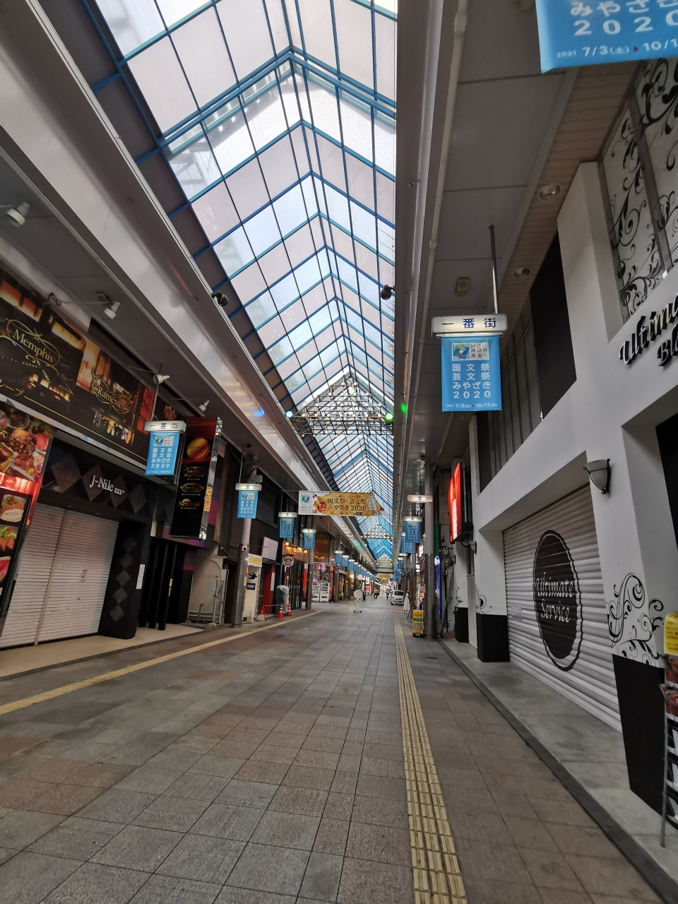 ドライブ旅行で大分別府から阿蘇と高千穂を経由して宮崎市へ。某トラベルサイトで予約したホテルに宿泊しました。食事がてら宮崎駅方向に歩いて散策しました。宮崎一番街はアーケードがある立派な商店街です。ですが、、コロナのせいかお店は閉まっているところが多く、人通りも少なくてやや寂しい感じでした。