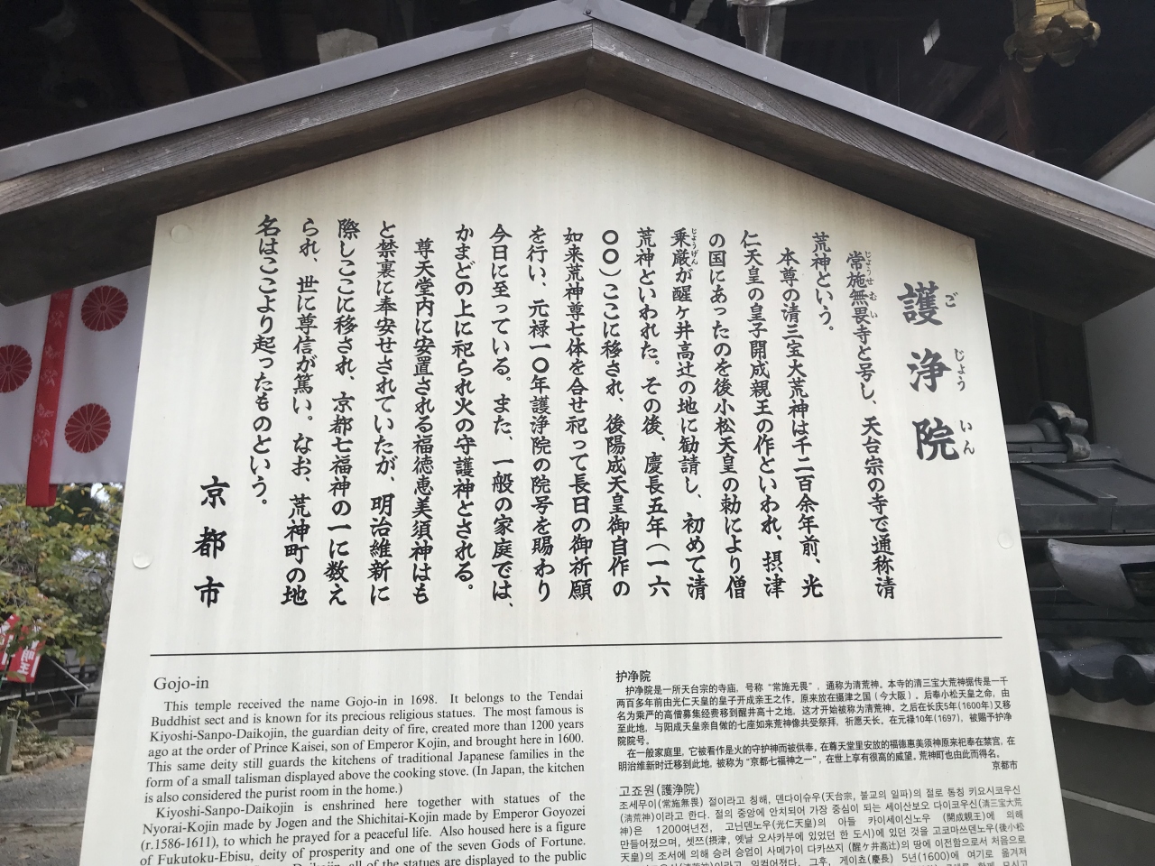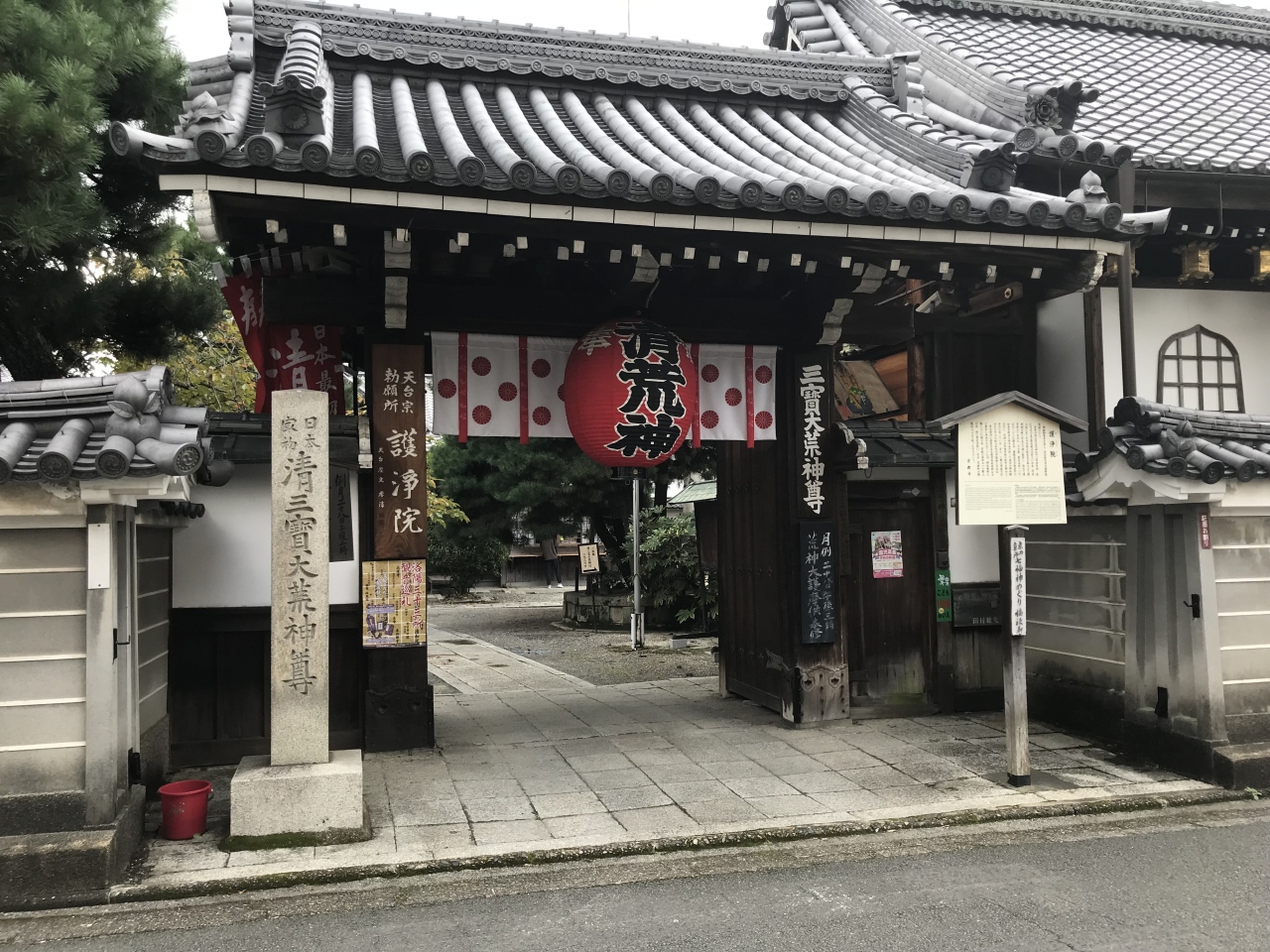 天台宗の寺で通称、清荒神といいます。本尊の清三宝大荒神は、約1200年前のものといわれ、後小松天皇の勅により、僧乗厳が摂津の国から醒ヶ井高辻の地に勧請しました。その後1600年に、現在の地に移され、後陽成天皇御自作の如来荒神尊七体を祀って長日後祈願を行い元禄10年護浄院の院号を賜り今日に至っています。また一般の家庭では釜戸の上に祀られ、火の守護神とされてきました。