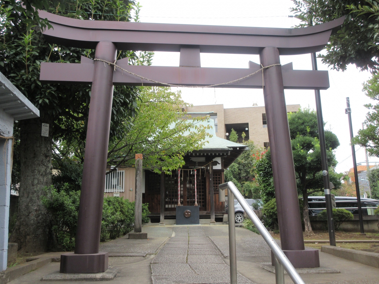 東急東横線・都立大学駅から300mほど、大岡山西住民センター向かいに建つこじんまりした神社です。境内には桜やアカガシなどの木が植えられ、鳥居横にはブロックに守られた庚申塔が2基置かれています。神社の由来や庚申塔の歴史などの説明がないため詳しいことはわかりませんでしたが、住宅地に建つ静かな神社でした。