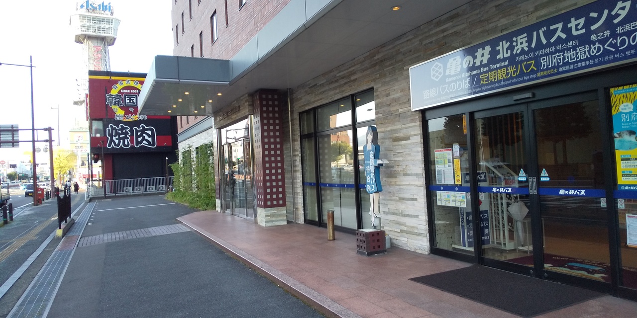 別府にあるバスセンターで西鉄イン別府というホテルの一階のワンコーナーを使っています。亀の井バス等のバス会社便のバス停とチケットうりばがあります。少し離れた所に別会社の大分交通別府北浜バスセンターがあり行き先やバスが違うので注意