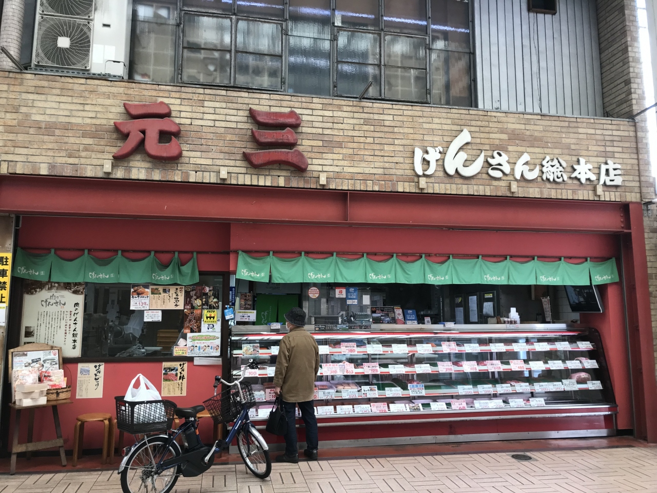 お肉のげんさん 総本店で、ミンチコロッケと牛すじコロッケを購入。注文を受けて、その場で5~6分で揚げてくれます。ミンチコロッケは、お肉の旨みが出ており、タネもそんなに甘くなくてちょい肉々しい絶妙な味付けでおいしい。牛すじコロッケは、牛すじの味がほのかに感じられるコロッケ。懐かしの復刻コロッケベースに+牛すじな感じでやや甘めでした。