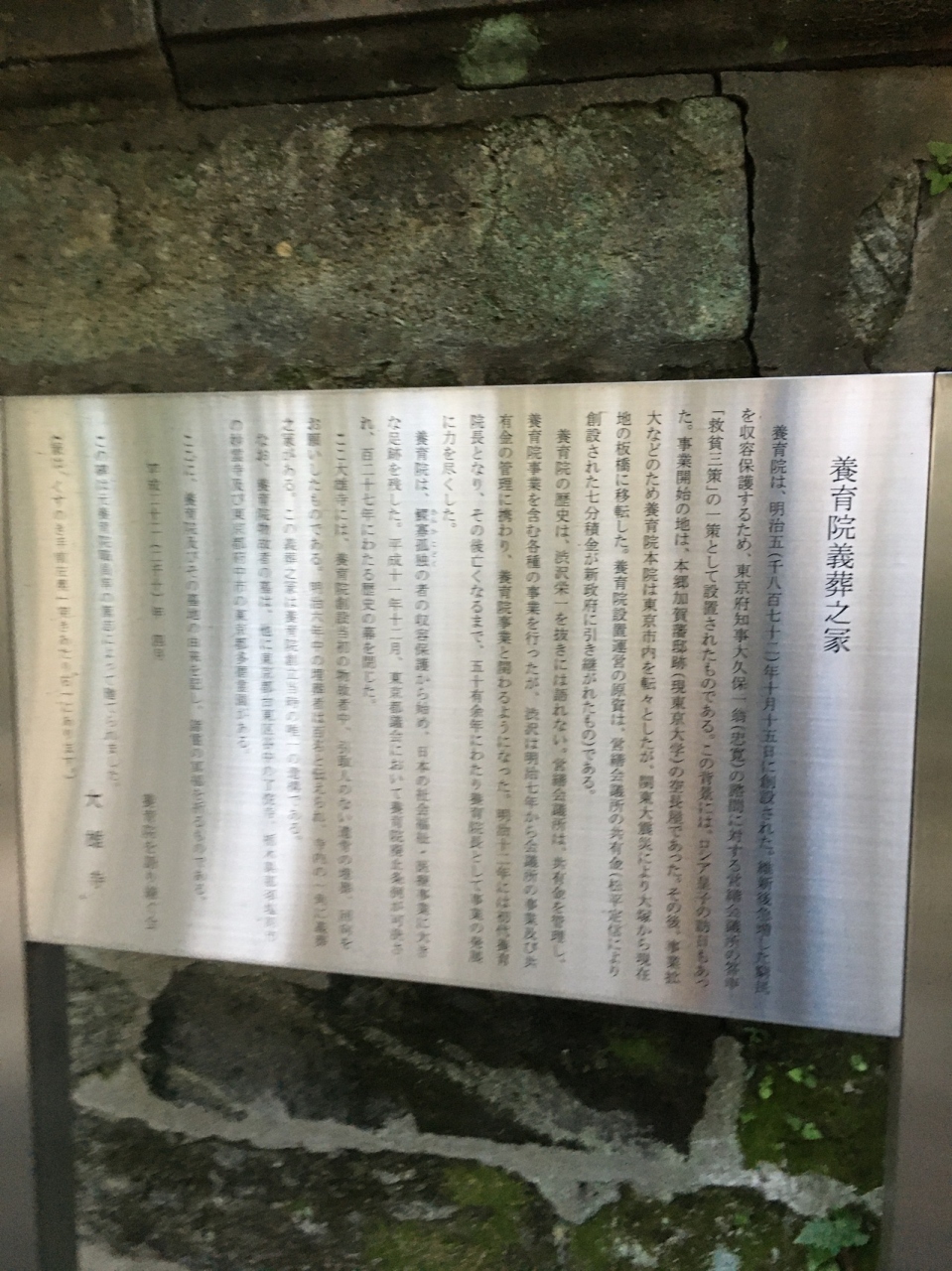 出入口には、物故者のお墓があることの看板がありました。物故者の引き取りがない遺骨をおさめた場所です。渋沢栄一が初代養育院長となり50年ぐらい院長だったとのことです。境内に入ると正面には本堂があり、左側にはお墓があります。
