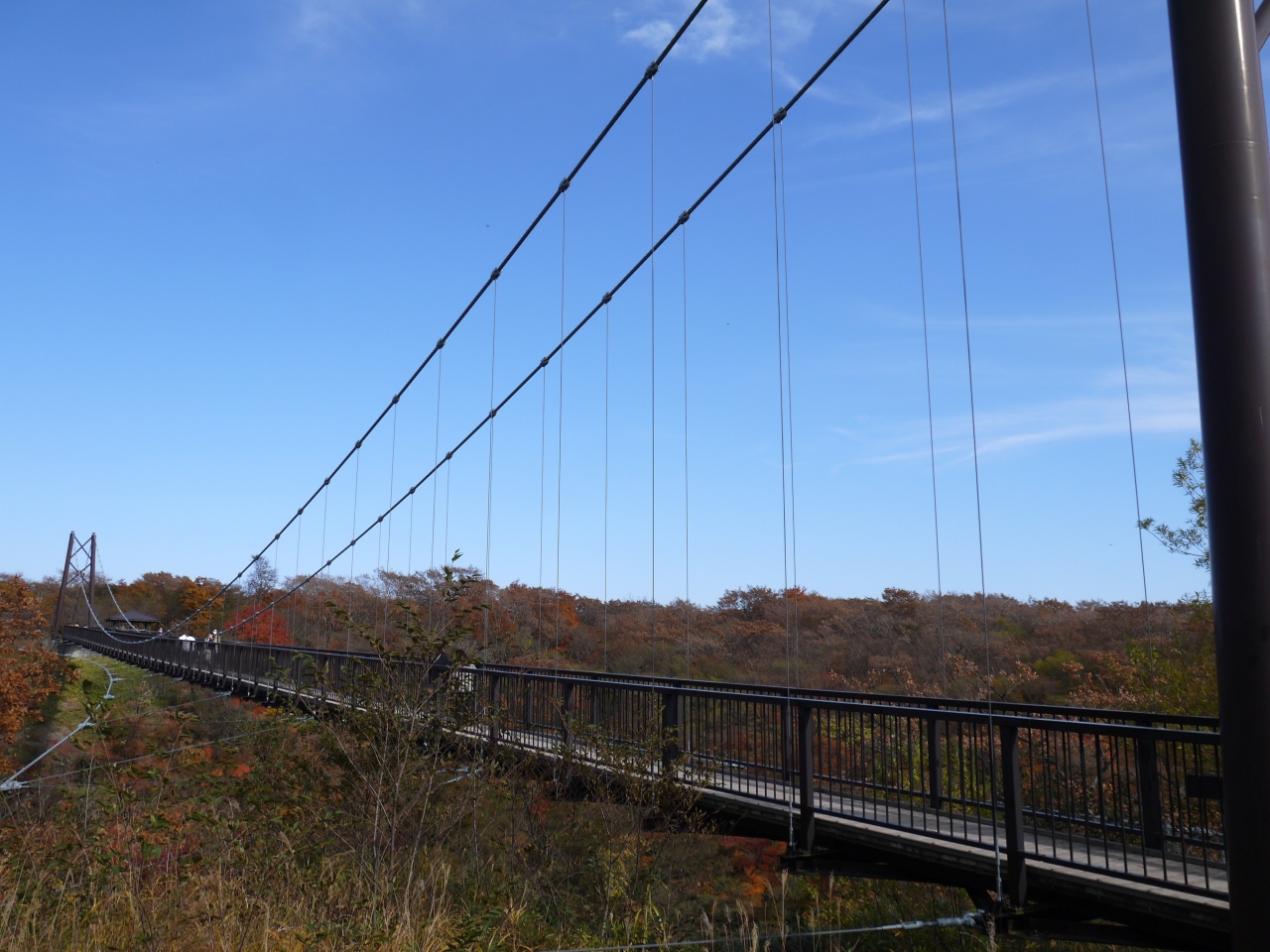 「つつじ吊橋」という名前ですが、橋の架かる渓谷が色づいてとても美しいです。吊橋の背後には那須岳のどっしりした雄姿が眺められて、こちらも絶景です。