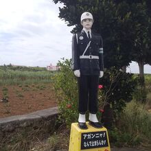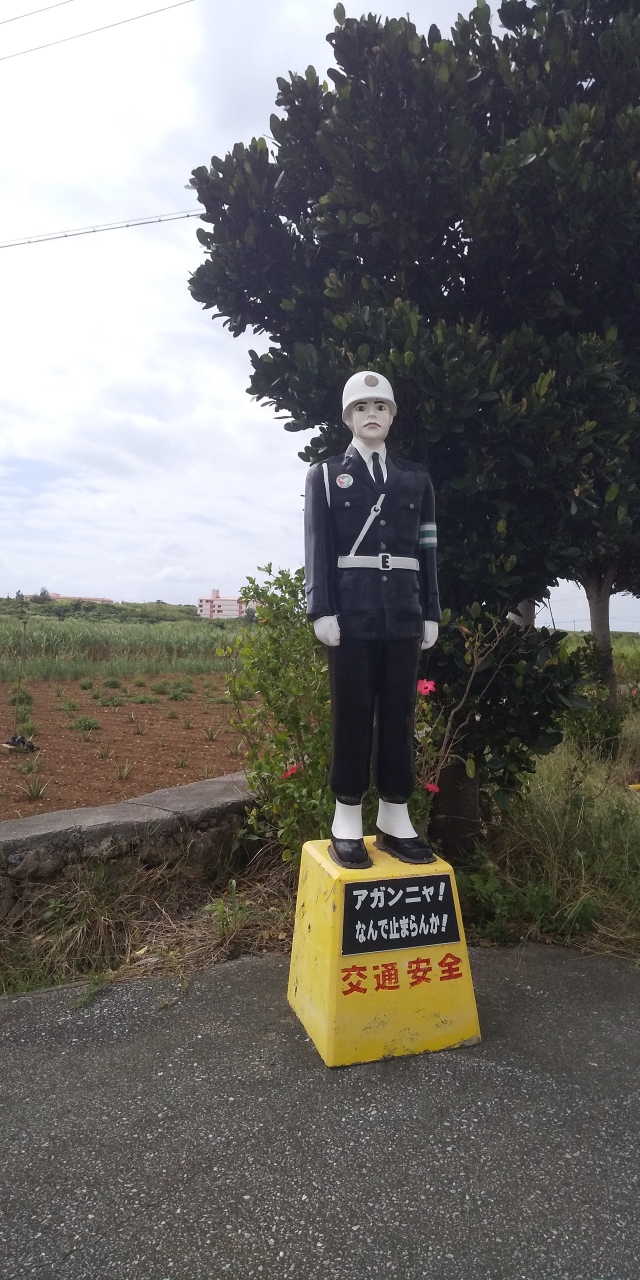 伊良部大橋を渡った伊良部島入ってすぐの場所や栗間大橋の近く、うえのドイツ村の近くなどの交差点に立ってます。顔が白く、みんなの安全を見守っています。