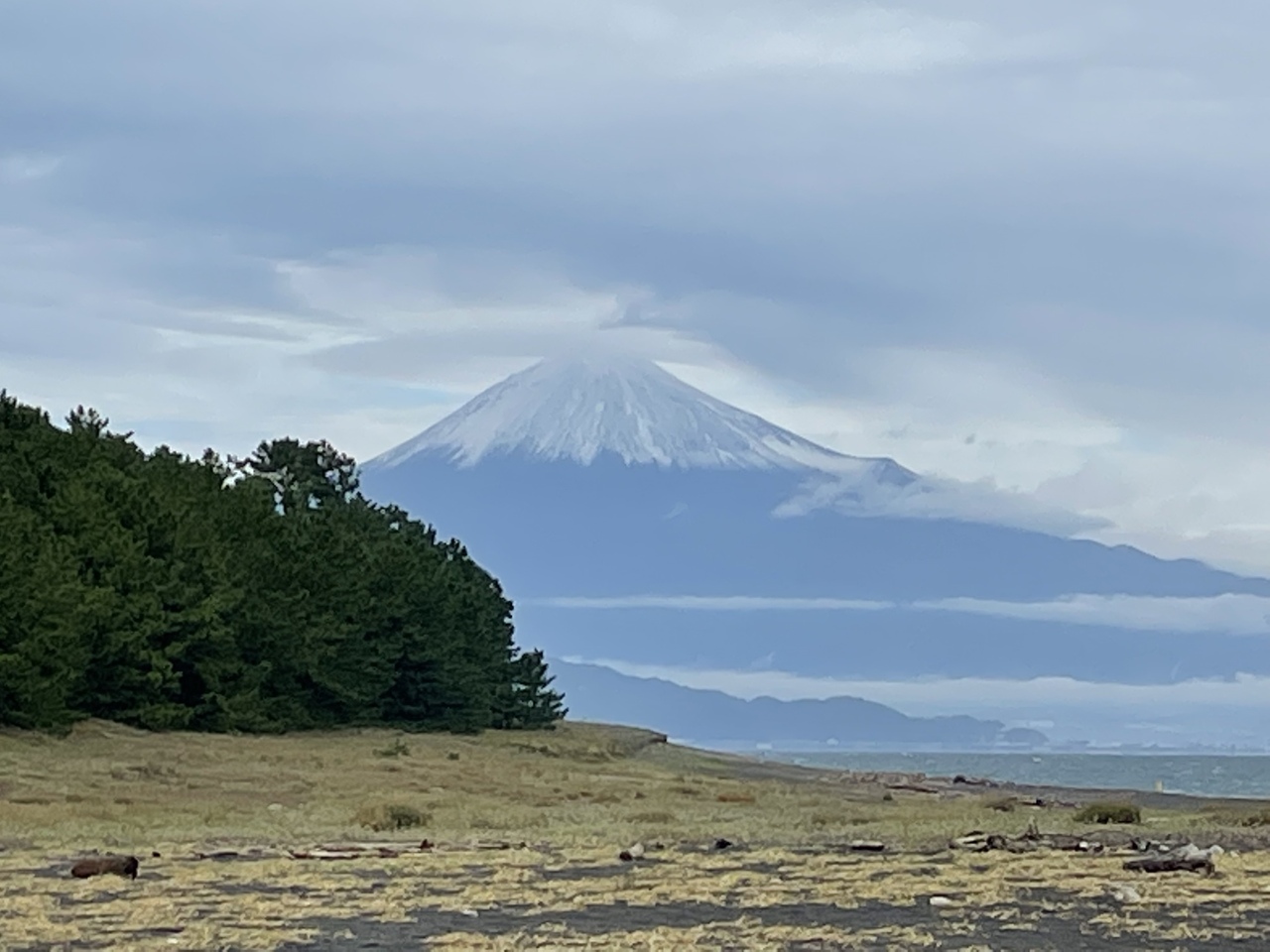 10月の中旬に訪れました。予報は雨でしたが、運よく雨が上がりました。神の道を進み、松原を抜けて海岸に出て振り向くと、雲間から富士山が見えました。前日は雪がほとんどなかったのですが、山頂付近は真っ白な冠雪富士でした。