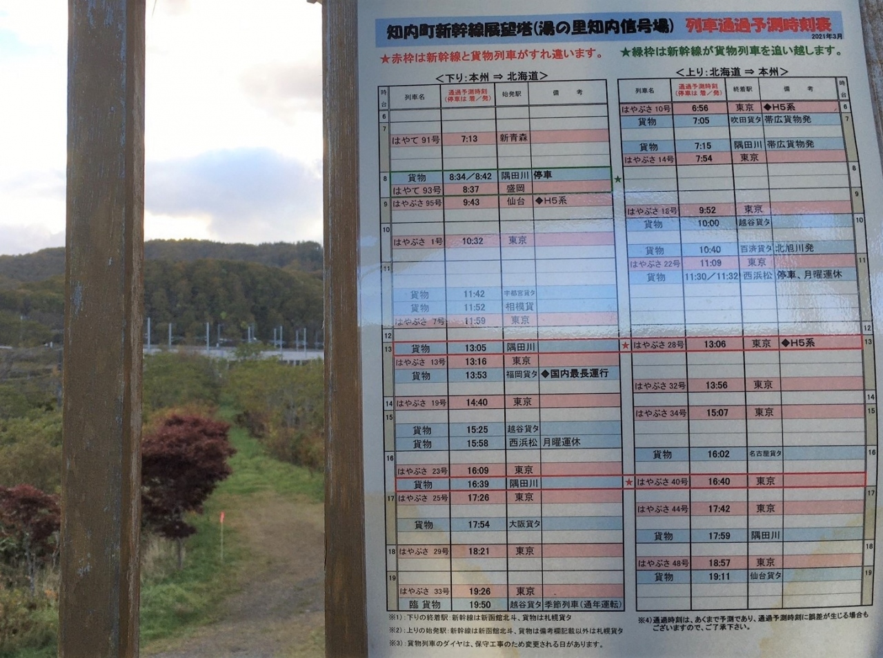 コロナの感染者は減少し緊急事態宣言も解除され、いよいよ行楽のシーズンとなり早々に函館までやってきました。国道228号線を松前方面にドライブしていると左側に「青函トンネル出口記念撮影台」があり新幹線を見ようと思い行ったのですがなかなか来ません、掲示している時刻表をみると通過したばかりのようで次の列車はまだまだのようです。通過時間を添付しました時間に合わせていくのも良いでしょう。ご参考までにね。きっと迫力あるでしょう。