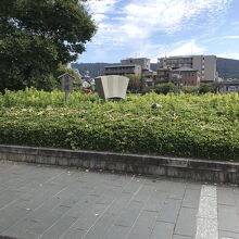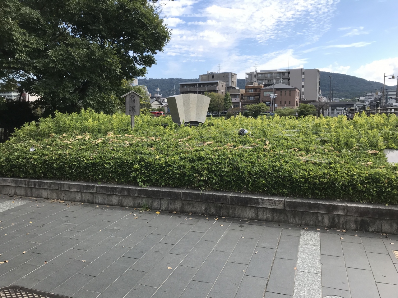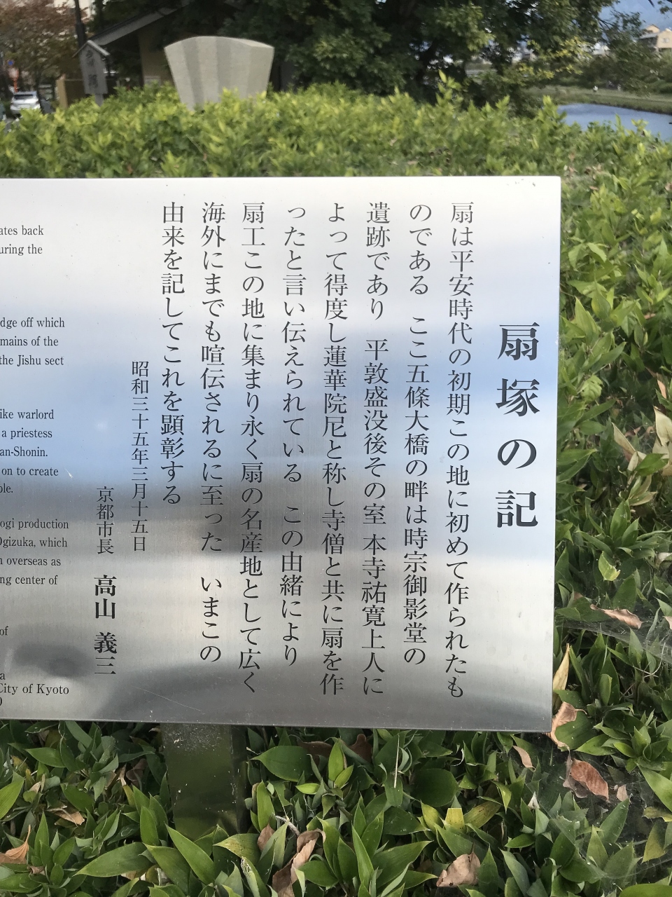 扇塚は、五条大橋の北西側たもとにあります。 「五条大橋の畔には時宗御影堂があり、一ノ谷の合戦で平敦盛が亡くなると、その妻は蓮華院尼と名乗り、寺僧とともにこの地で扇をつくった」そうです。 御影堂は1284年(弘安7年)大橋の近くに建立された新善光寺の別称です。御影堂扇はこの寺から出した扇で、古くは御末広師が集まった扇の産地だったそうです。1960年(昭和35年)にこの御影石で作った扇形の碑が建立されました。