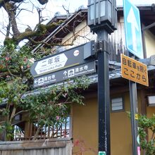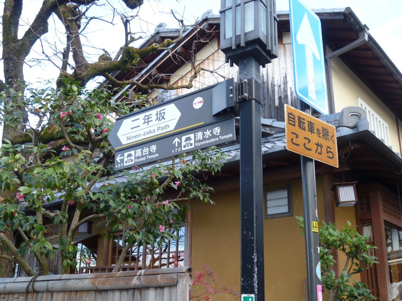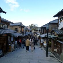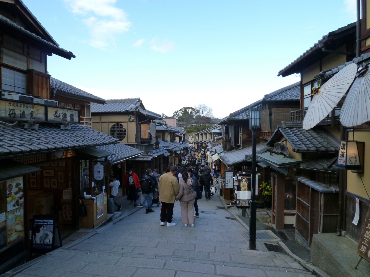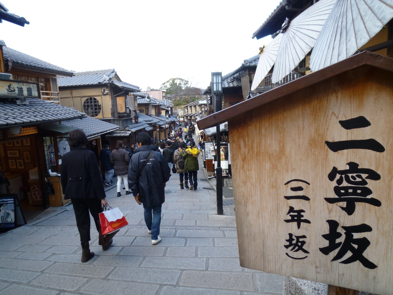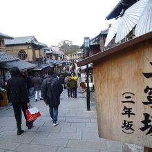 二年坂は、一年坂より道幅が広くて距離も150メートルと長く、一気に観光地の雰囲気になります。産寧坂(三年坂)の手前にある坂という意味でこの名になったとされています。「ここでつまずき転ぶと2年以内に死ぬ」という言い伝えは「石段坂道は気を付けて」という警句が語り伝えられたものです。道幅は狭く、両側にお店が立ち並んでいます、そのため観光シーズンには人でいっぱいになります。二年坂を歩いているだけで京都の気分に浸れます。