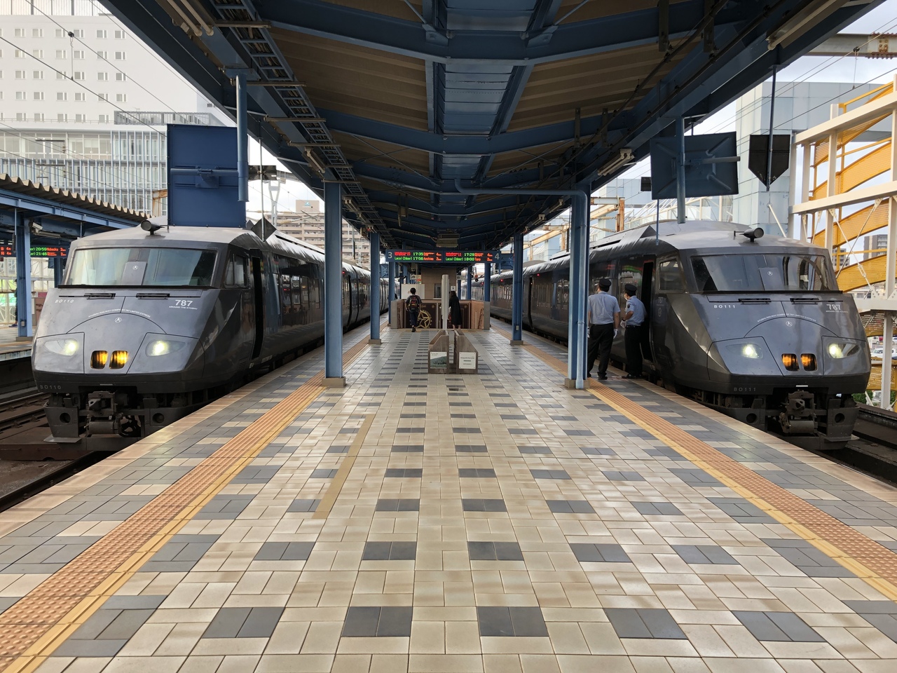 車両は全列車が787系に統一されており、下り5、9、15、19号、上り4、6、14、18号は6両編成でDXグリーン車、グリーン個室.指定席のボックスシートあり、そのほかは4両編成で1号車の一部がグリーン車で、ワンマン運転となっています。