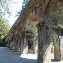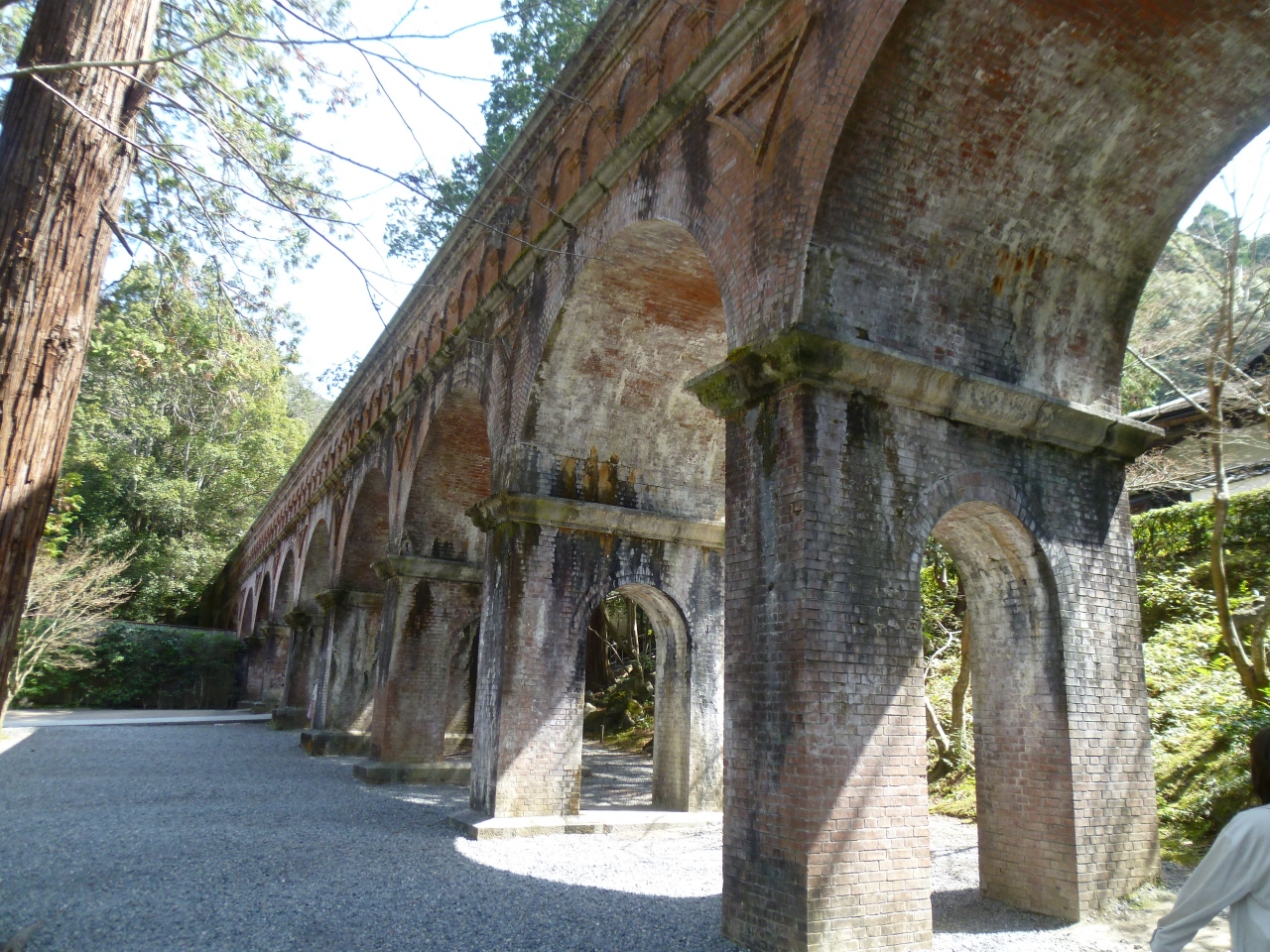水路閣は、琵琶湖疏水の分線にある水路橋で1888年(明治21年)完成しました。南禅寺境内を通過するため、周辺の景観に配慮して田辺朔郎が設計、デザインしました。全長93.2メートル(幅4メートル、高9メートル)レンガ、花崗岩造り、アーチ型橋脚の風格ある構造物で、静かな東山の風景に溶け込んでいます。京都で、私が何度でも訪れたくなる場所です。