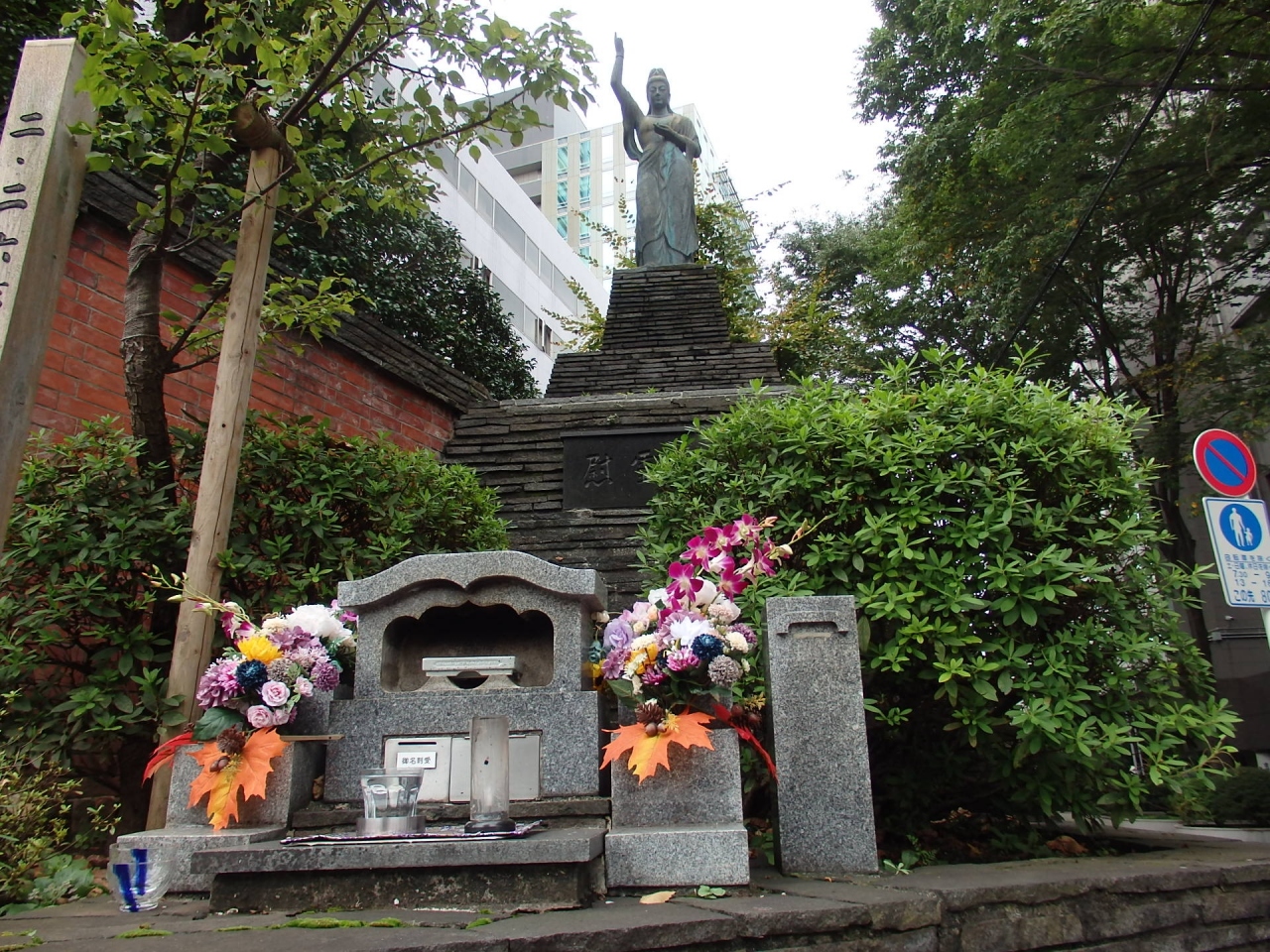 慰霊像は渋谷税務署の北西角に建っています。二二六事件とは1936年2月26日に青年将校が起こしたクーデターで未遂事件である。旧陸軍刑務所跡地(写真に見える赤レンガは刑務所壁だったといわれる)に加害者側の遺族により建立された慰霊像は、事件で命を落とした被害者も含めた全ての犠牲者の鎮魂を目的としているそうです。被害者側のご遺族からすると複雑な気持ちを持たれると思います。被害者側のご遺族と加害者側のご遺族との交流が始まっているという記事を最近読みました。被害者側のご遺族の方は良く一歩を踏み出したなと感心しました