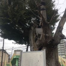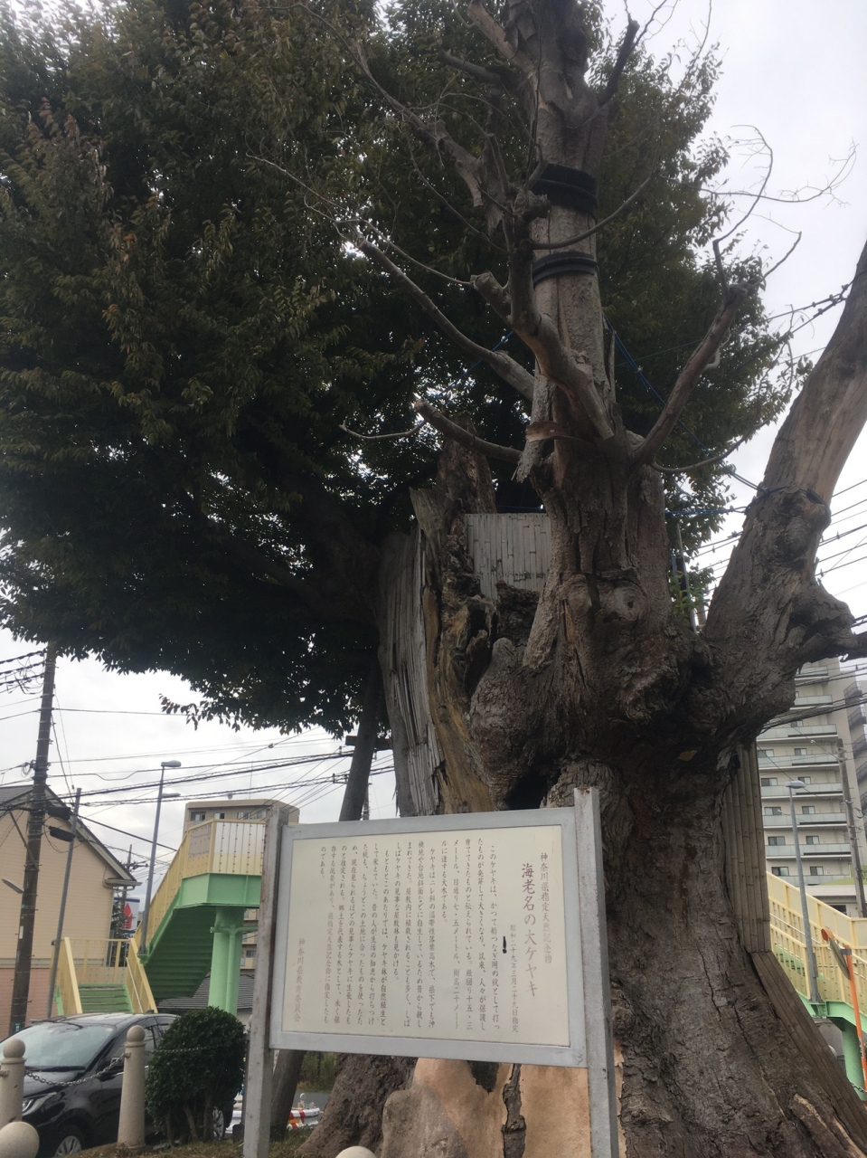 厚木街道沿いで相模国分寺の参道入り口に立つケヤキの巨木。県天然記念物に指定されており樹齢約580年と説明されています。当時、相模湾が内陸深く入り込み、この辺りが入江の頃、船を繋ぎ止めるために打ち込んだケヤキの杭が根付いて成長したと言い伝えられています。さすが老木なので補強手当てがいたいたしいです。